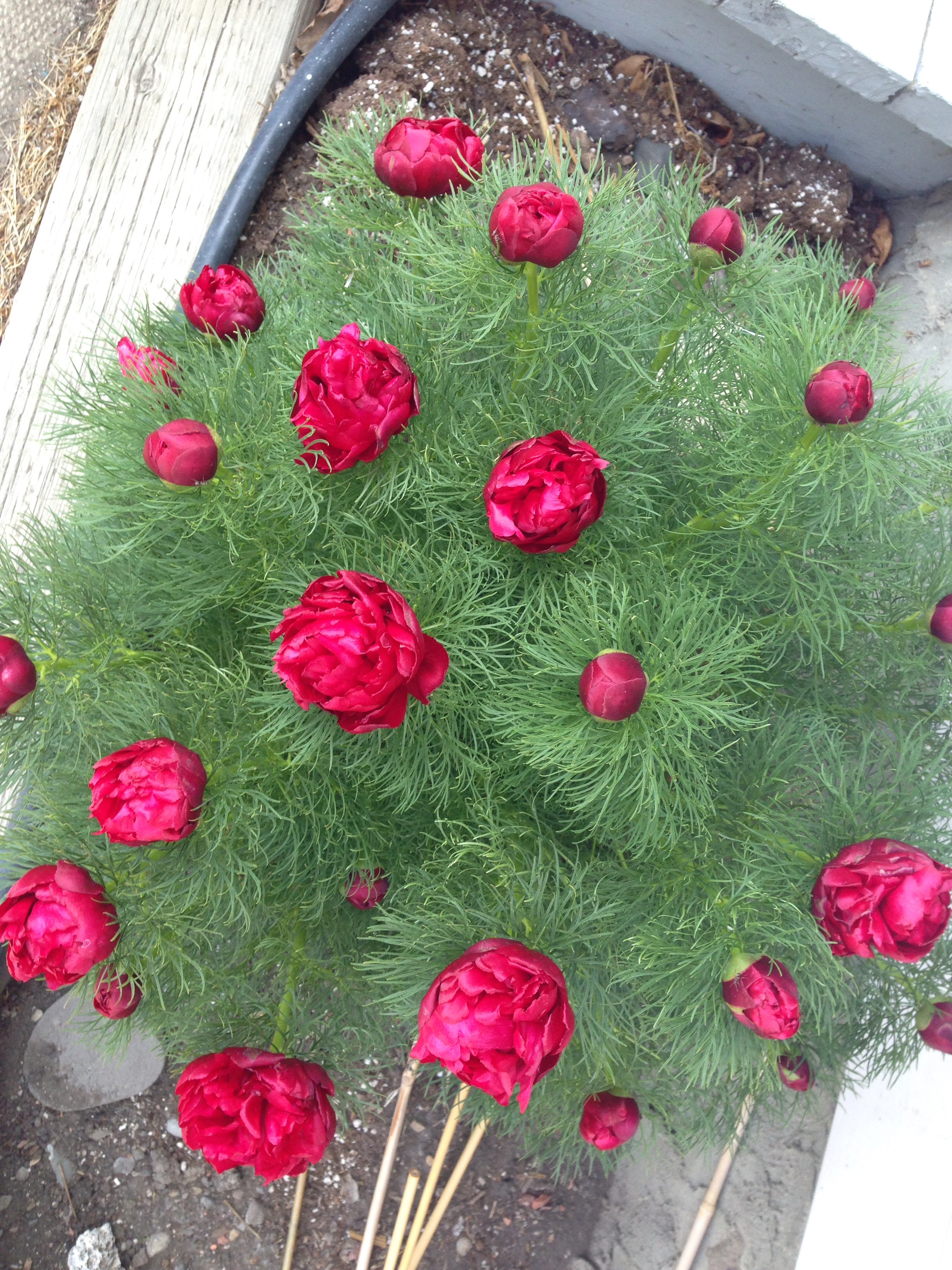 The magenta blooms are my Fern Leaf Peony. It is always the first perennial to bloom in my garden. The blue ones are Pulmonaria (Lungwort).