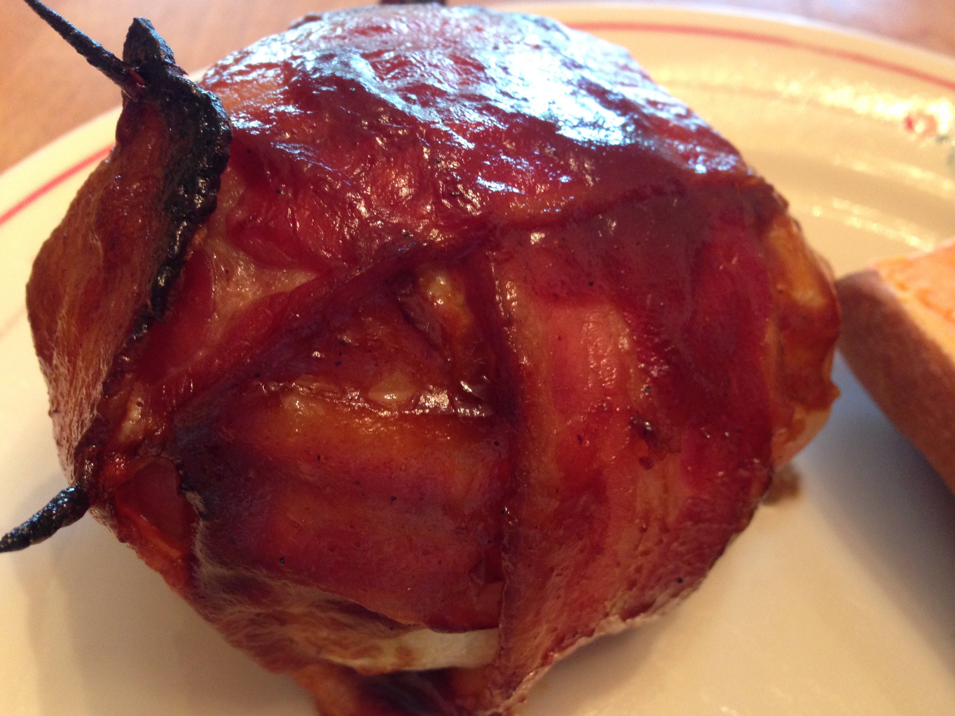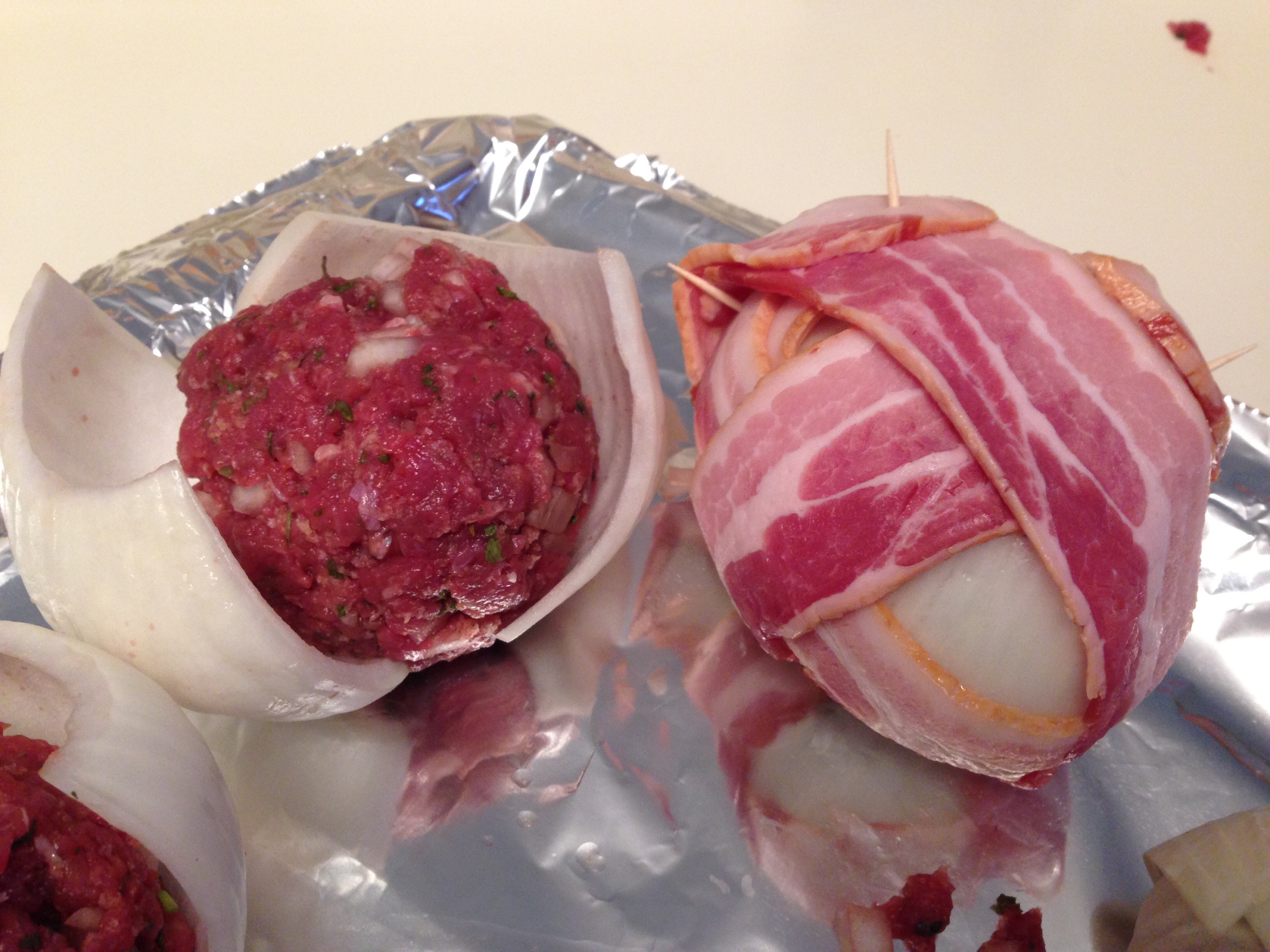 Mix the meatballs using the above and place two halves of the onion layer around the meatball to enclose it. Wrap each ball with three slices of bacon, securing them with toothpicks.