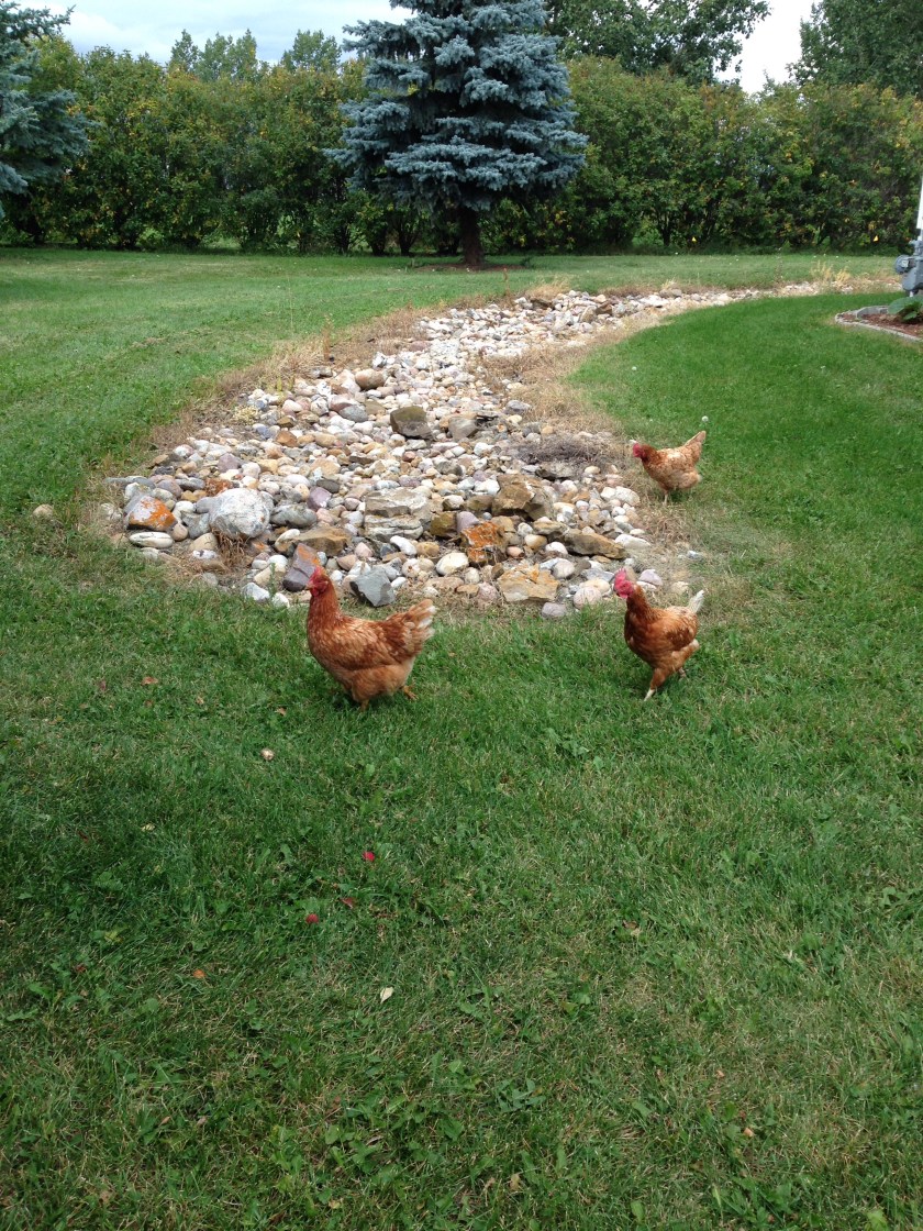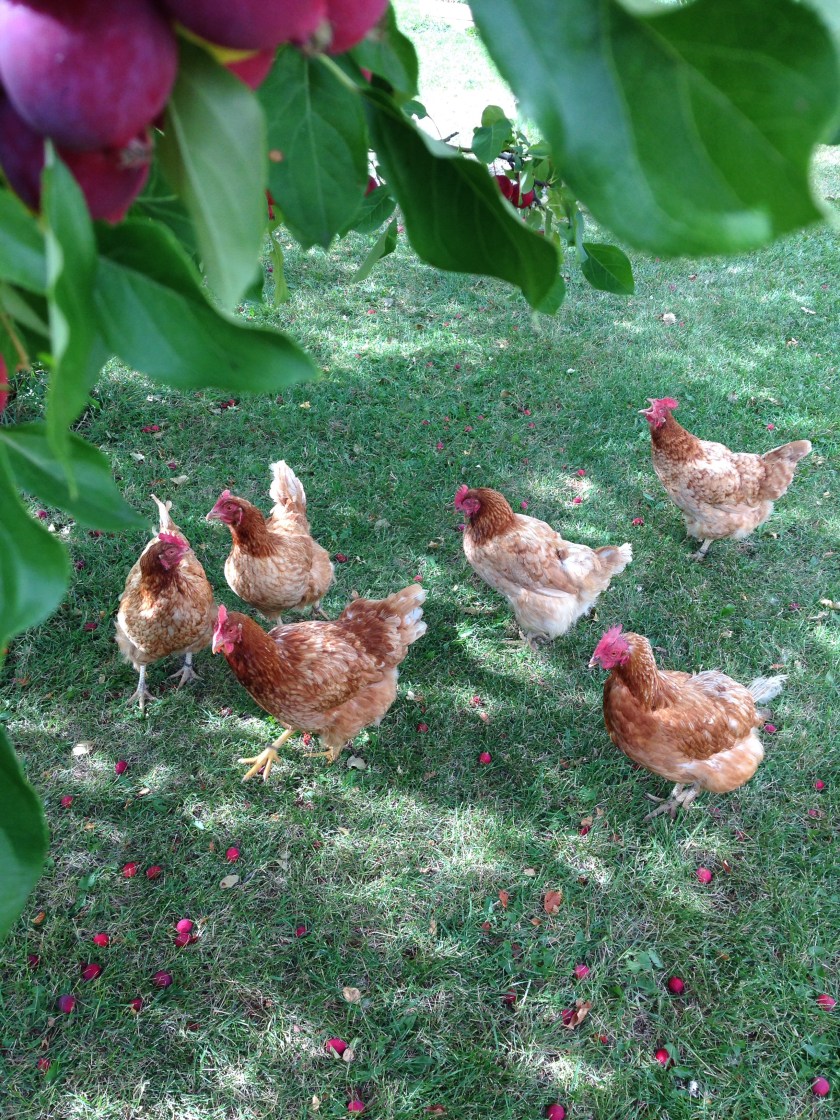 Friday, one of my friends asked if I wanted to come and pick crab apples. Her tree is loaded with them. We had a great apple tree at our old house, and I thought I would be missing the apple sauce, juice and pie that it provided us with, but we are set once again. How wonderful. As I was filling my bag with apples, all her hens ran over to see if I had brought treats. Alas, I had not, but they stayed with me and pecked and scratched for quite a while. I love the company of hens – the little noises they make, their peaceful manner and gentle curiosity. I used to love helping my uncle care for his chickens on summer vacations, so ‘hanging with the hens” is a big treat for me. Happy days.