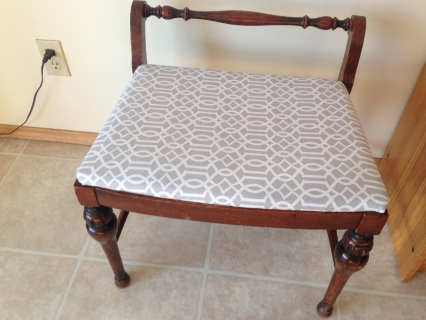 This was a 10 minute makeover for a beloved seat of mine. I inherited it from my grandma twenty years ago, along with a beautiful old dresser, but have been using it with a little desk I refinished as a teenager (my dad was fond of auctions). The roses did not seem right in that setting, so I recovered the seat in a grey and white fabric which works well. A scrap of fabric breathed new life into a favourite piece.