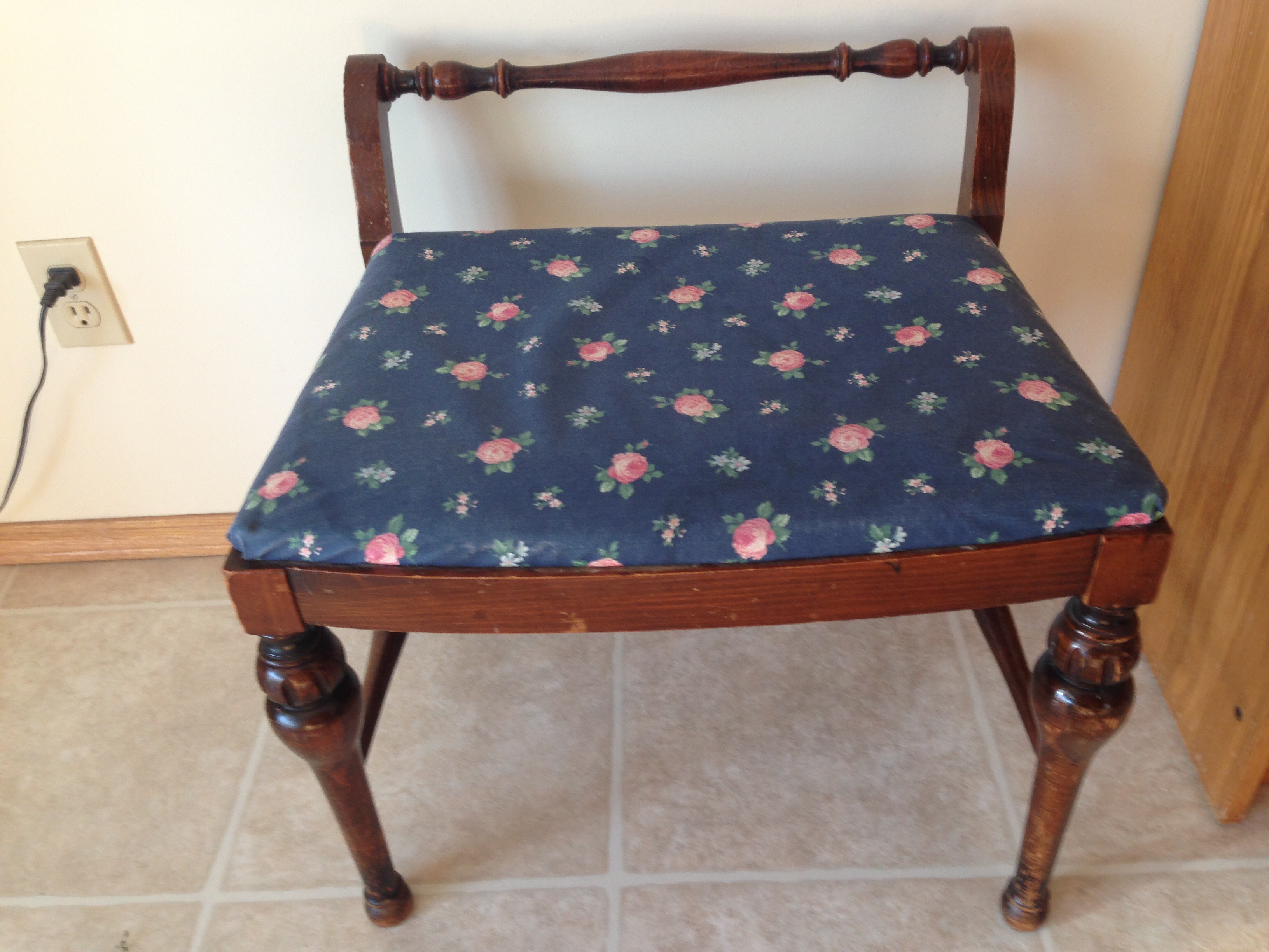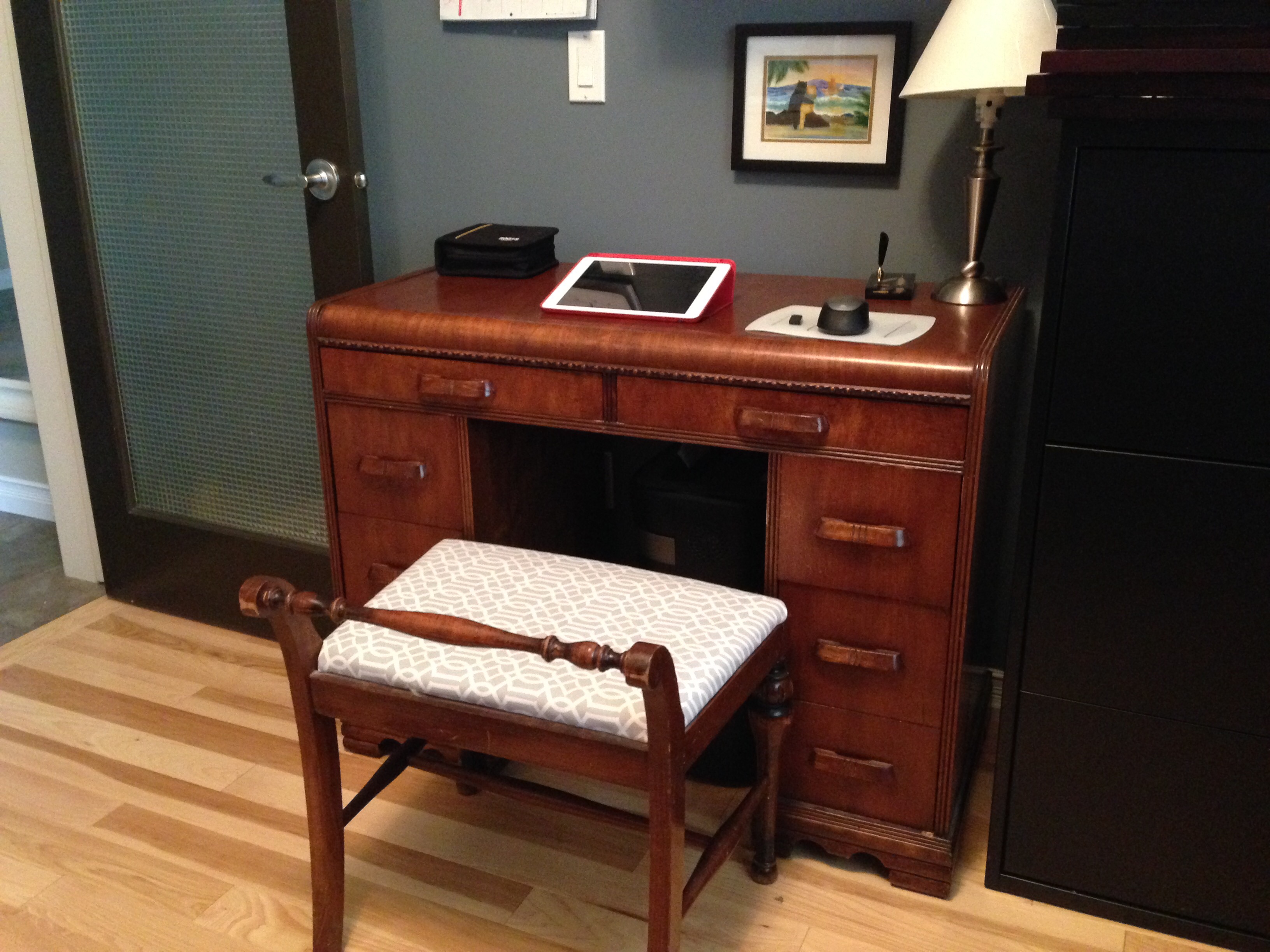 This was a 10 minute makeover for a beloved seat of mine. I inherited it from my grandma twenty years ago, along with a beautiful old dresser, but have been using it with a little desk I refinished as a teenager (my dad was fond of auctions). The roses did not seem right in that setting, so I recovered the seat in a grey and white fabric which works well. A scrap of fabric breathed new life into a favourite piece.