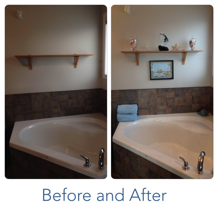 One of the pleasures of moving into a new house is the blank slate available for decorating. The wood shelf on the wall in this room made me think of a boardwalk at the beach and I was inspired to add a few beach-y touches to the room. Small transformations such as this make the place seem like our home, instead of a new house. Our last en suite featured ferns, so this is a nice change.
