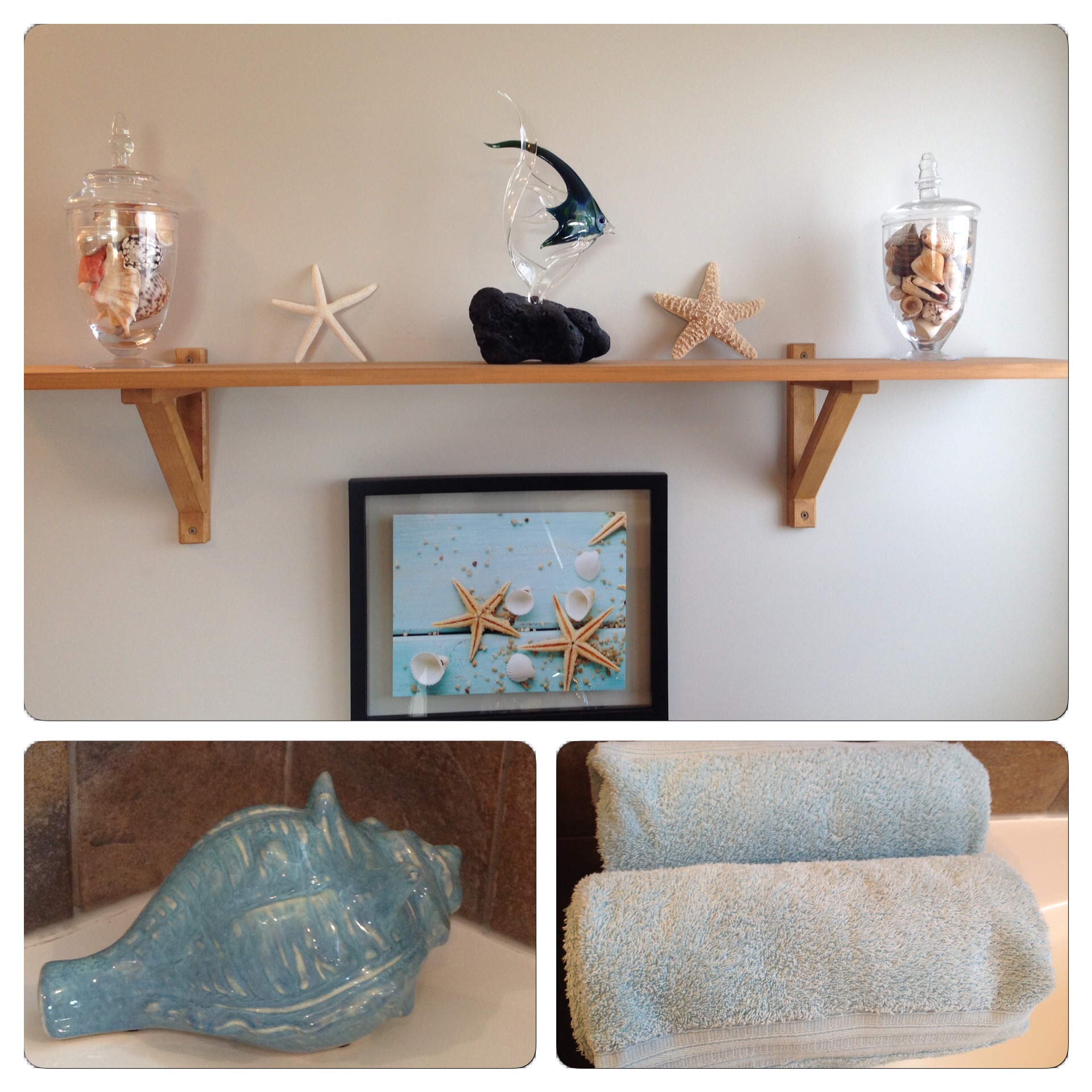 One of the pleasures of moving into a new house is the blank slate available for decorating. The wood shelf on the wall in this room made me think of a boardwalk at the beach and I was inspired to add a few beach-y touches to the room. Small transformations such as this make the place seem like our home, instead of a new house. Our last en suite featured ferns, so this is a nice change.