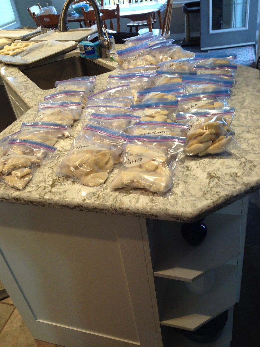 Yesterday I had two friends over to help break in my new kitchen. We made 42 dozen perogies! That is 504 of them, so they should last us quite a while! We made potato/cheese/onion, potato/cheese/bacon, sauerkraut/carrot, and cottage cheese/chive.