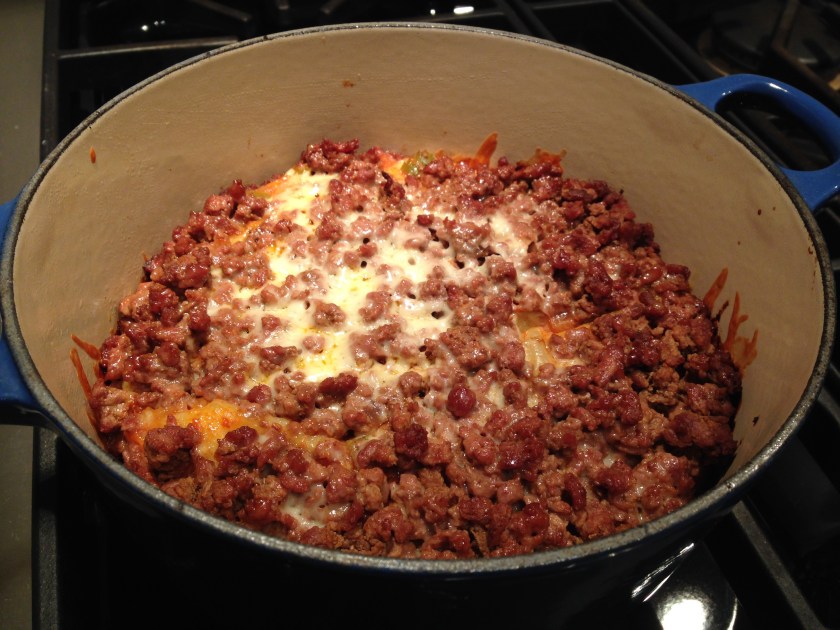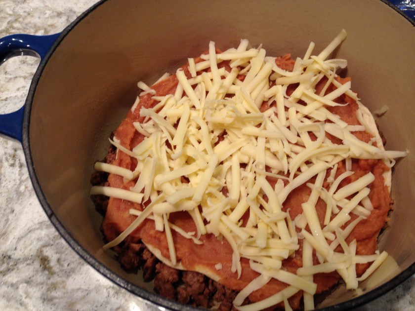Brown meat, add taco seasoning. Oil a pan the size of your tortillas. I have used a le Crueset pot in the photo, but a spring form pan or deep pie plate works great too. Place a tortilla in bottom of pan. Cover with half the meat mixture. Cover meat with another tortilla. Add beans and half of the cheese.