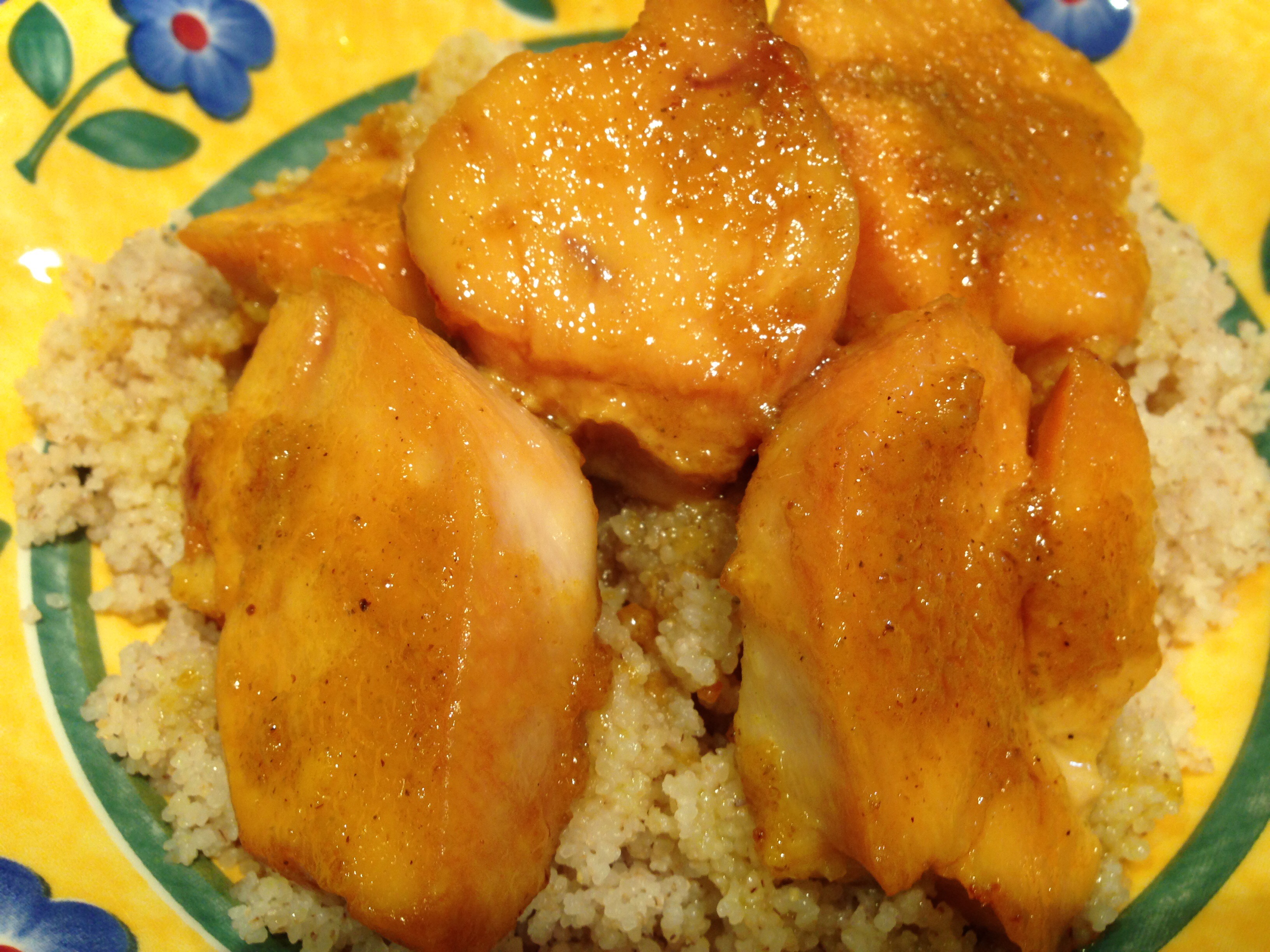 In a 9×9″ baking dish, melt butter. Combine honey, juice, mustard, salt, and curry powder. Pour over chicken coating it well. Pour into butter. Bake, uncovered, about 1 hour at 375°. The sauce will thicken as liquid evaporates. Serve over couscous to soak up the extra sauce.