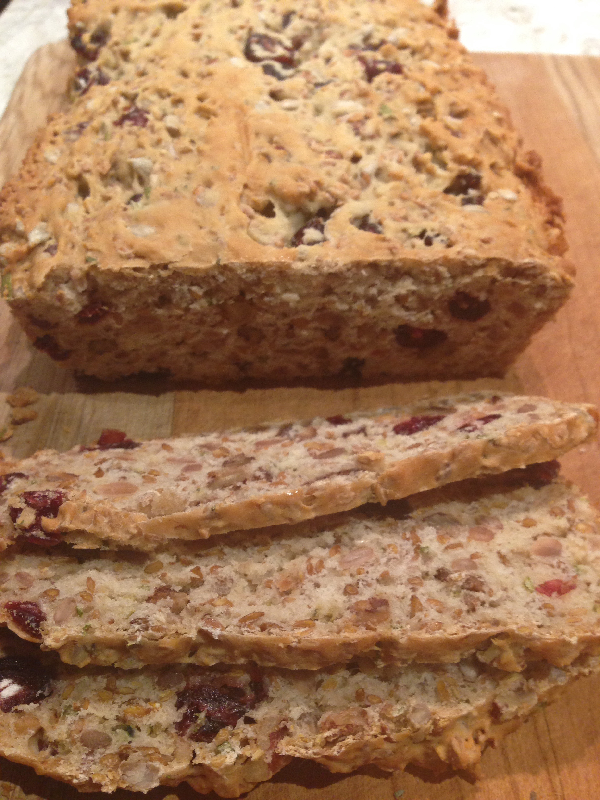 My fantastic hair stylist is also a foodie, and passed me this recipe from Atco Blue Flame Kitchen. I am sure it is good as written in the link above but I modified it to suit the ingredients I had on hand, and it turned out to be delicious as well. (I substituted all purpose flour for whole wheat, pecans for walnuts, and sunflower seeds for pumpkin seeds). I am including some photos of the procedure below, as the Atco recipe does not provide any.