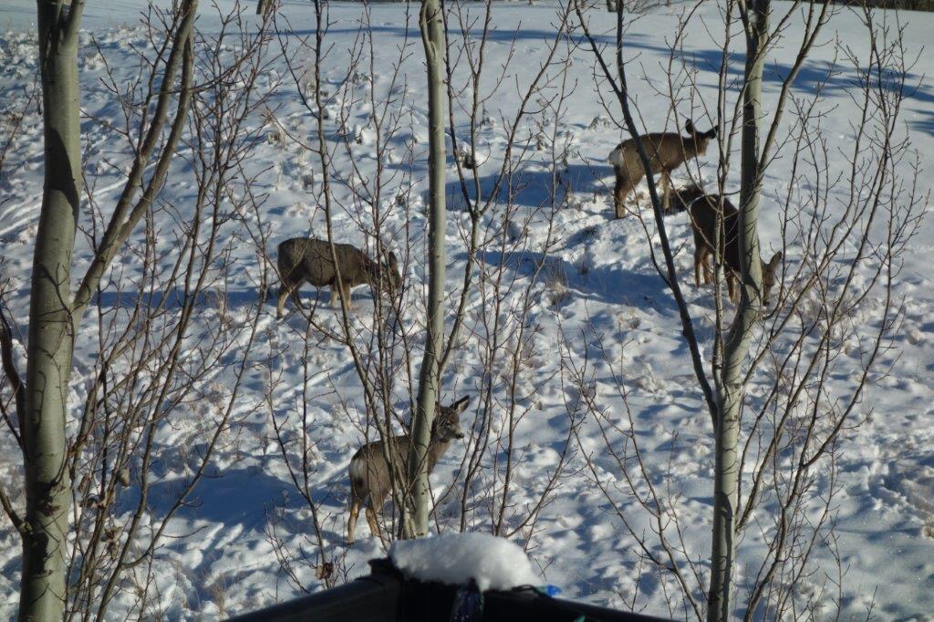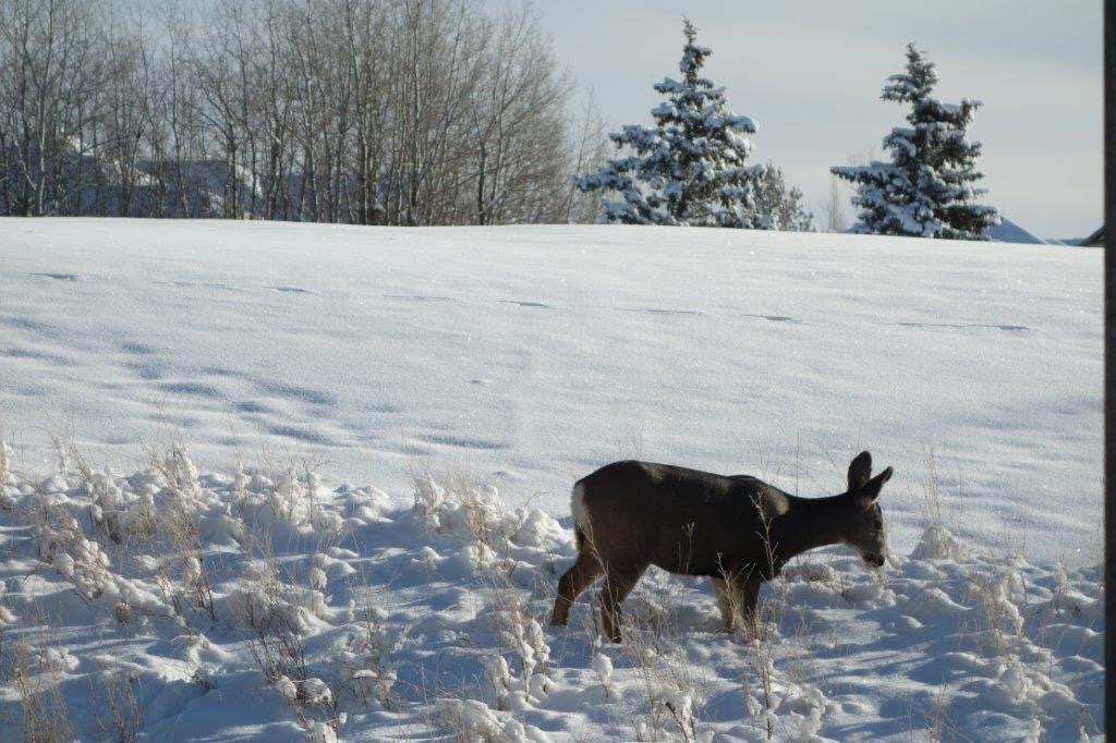 I love to watch the deer as they graze in the morning. The younger ones do a bit of bounding, but mostly they paw through the snow to expose grass and then lick the snow of each other’s faces. It amazes me that they can find enough food to sustain them in the winter when there is just dried grasses and leaves available.