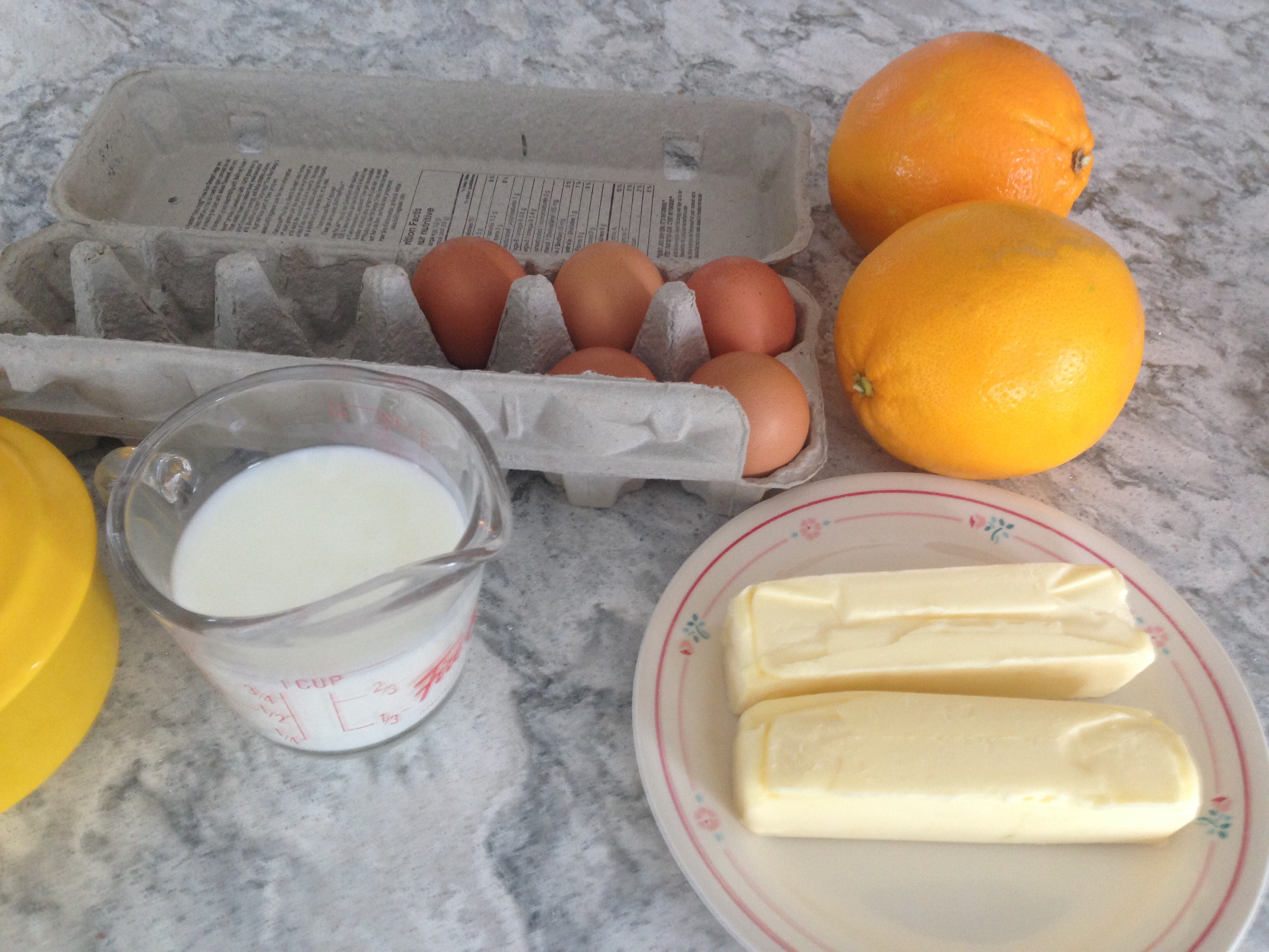 Cream the butter and sugar together. Add the eggs, one at a time, beating after each one. Stir in the zest. Add the half the dry ingredients, then half the wet, mixing after each. Repeat with the remaining dry and wet ingredients. Pour into greased bundt pan. Bake in a preheated 350 degree F oven for 45-55 minutes, or until top is dry and toothpick comes out cleanly. Let sit 10 minutes in the pan to cool. Turn out of pan onto cooling rack. Brush with soaking glaze, below.
