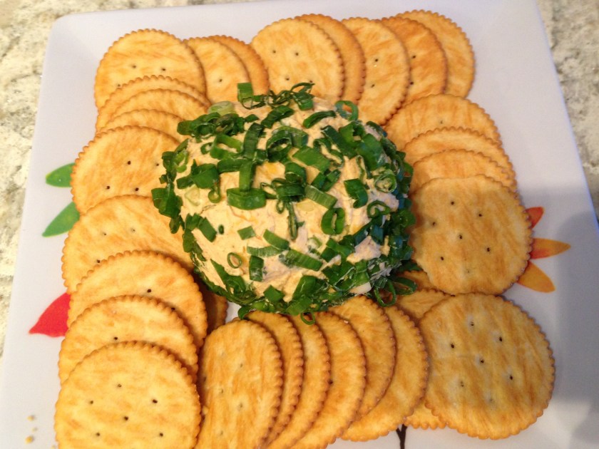 A cheese ball is a party standard when it comes to appetizers . Here is a simple one. I made one ball rolled in pecans, and another smaller one rolled in green onions for the nut-free crowd.
