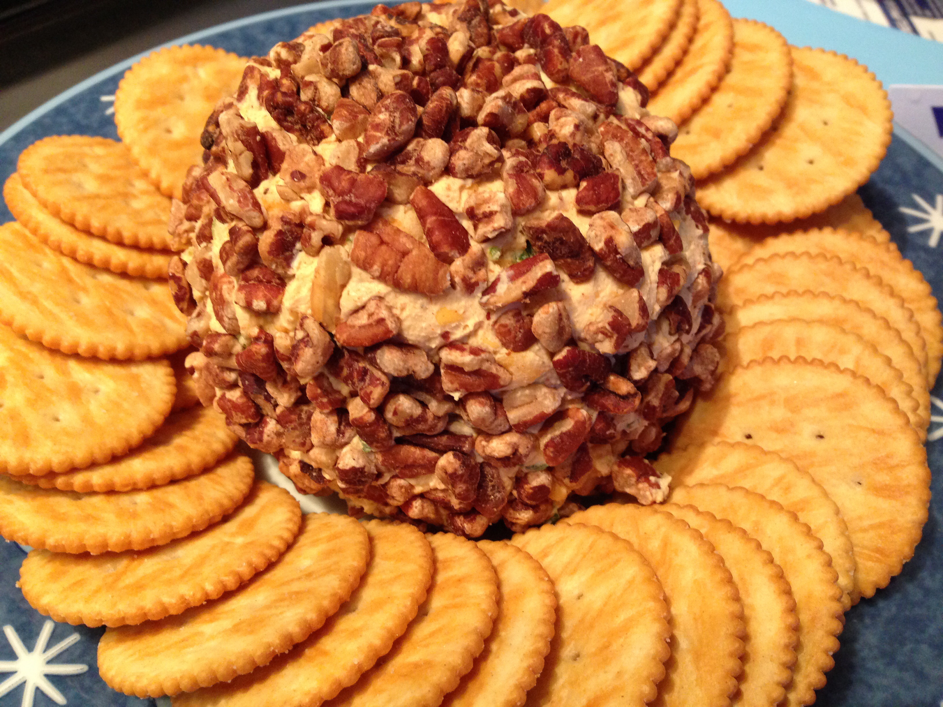 A cheese ball is a party standard when it comes to appetizers . Here is a simple one. I made one ball rolled in pecans, and another smaller one rolled in green onions for the nut-free crowd.