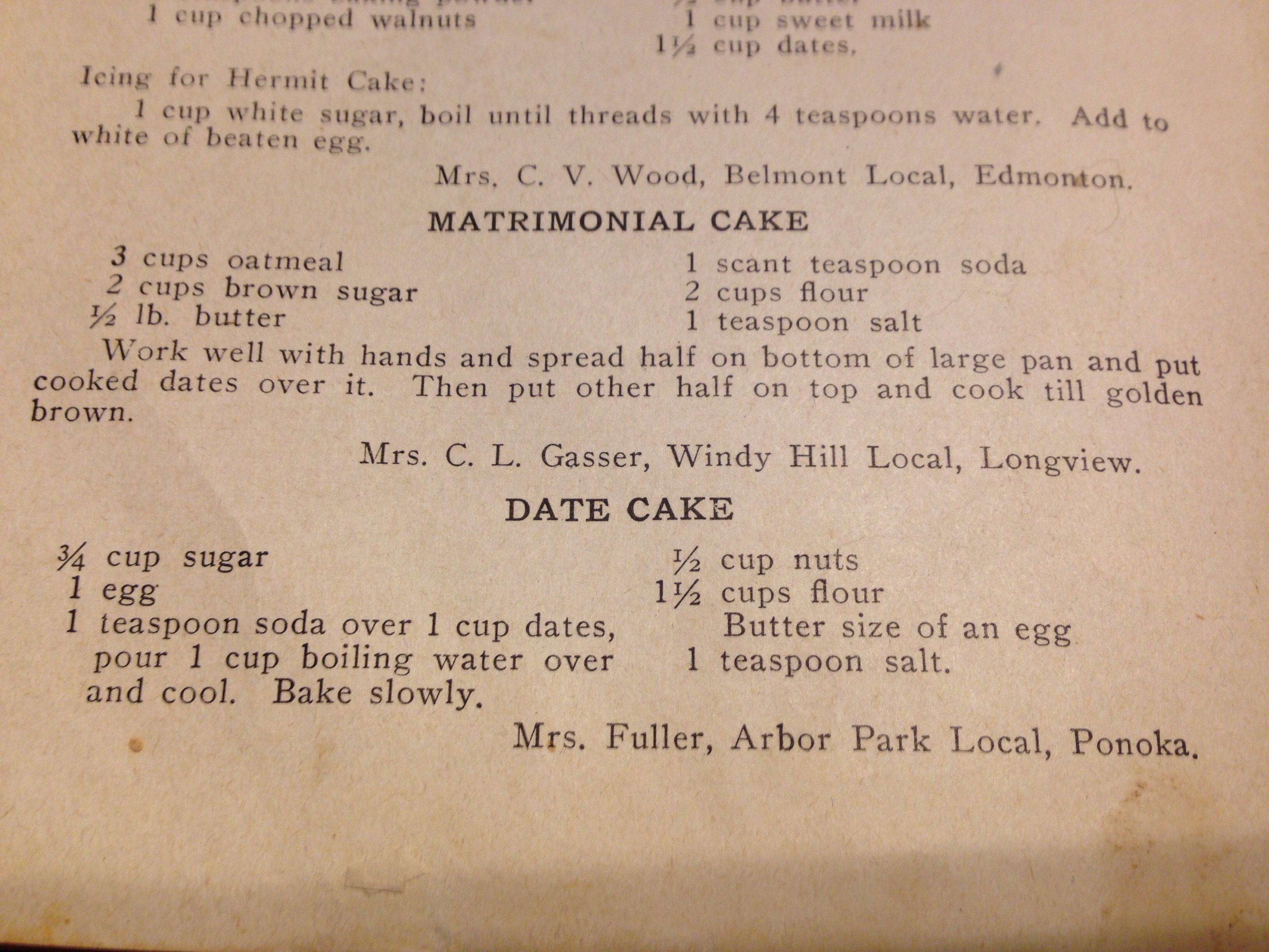 I pulled out my Grandma’s United Farm Women of Alberta cookbook, 1946 edition, which is a collection of recipes their members had submitted for publication in the cookbook. It was a well-used cookbook in Gram’s kitchen, with newspaper clippings taped inside the cover and little notes and splatters in the margins. I even found an old bingo card as a bookmark! You have to respect the cooks from her day, working from the old style of recipe notation: no method, just the ingredients. Why take up paper writing out stuff everyone knew how to do! Also, no oven temperatures were given because a lot of people did not have a dial to set – they were burning wood, coal or dried cow pats in their ovens.
