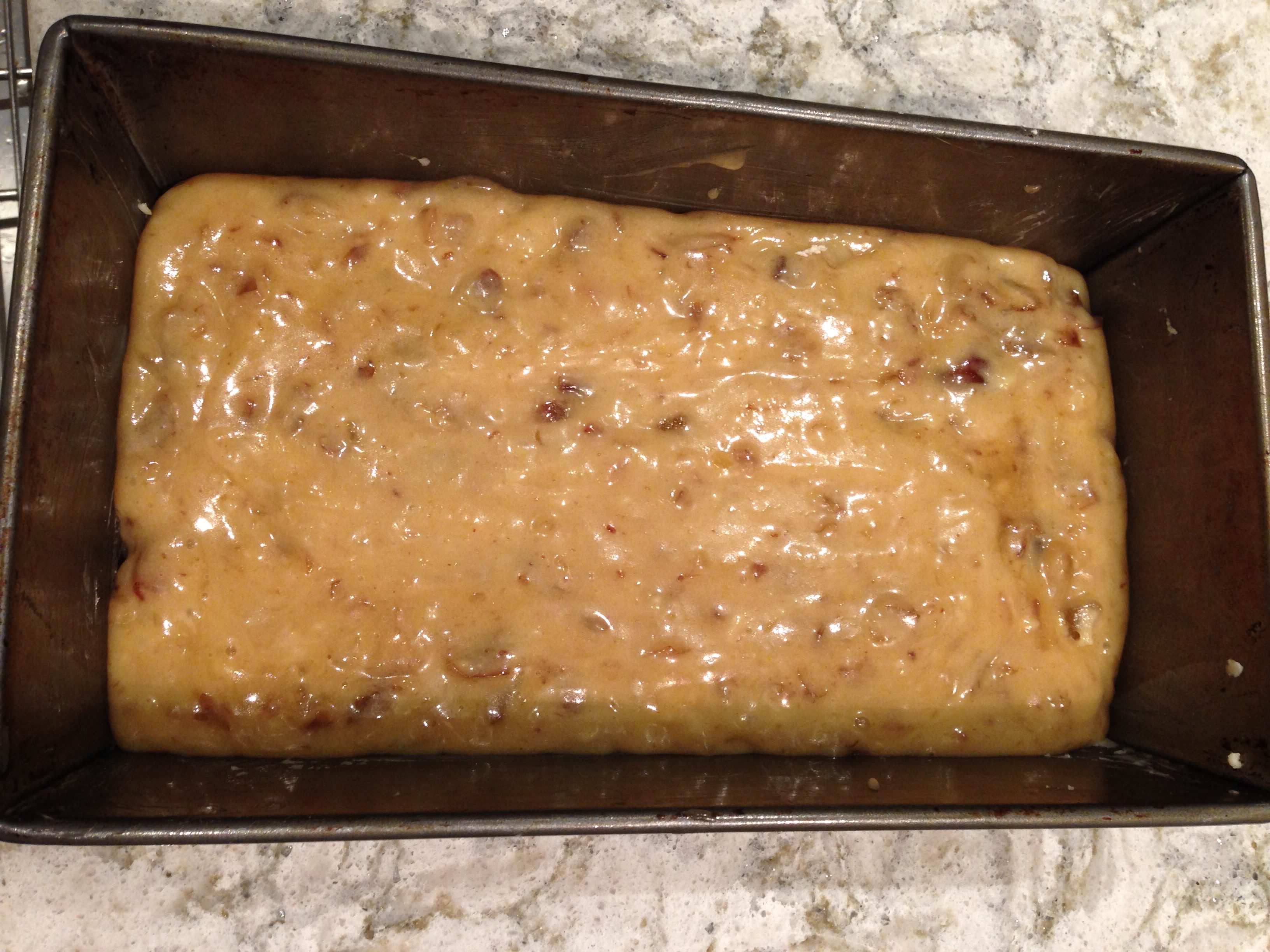Pour into a greased loaf pan and bake at 350 degrees for 45-60 minutes, or until a toothpick comes out clean when poked in the middle of the loaf.