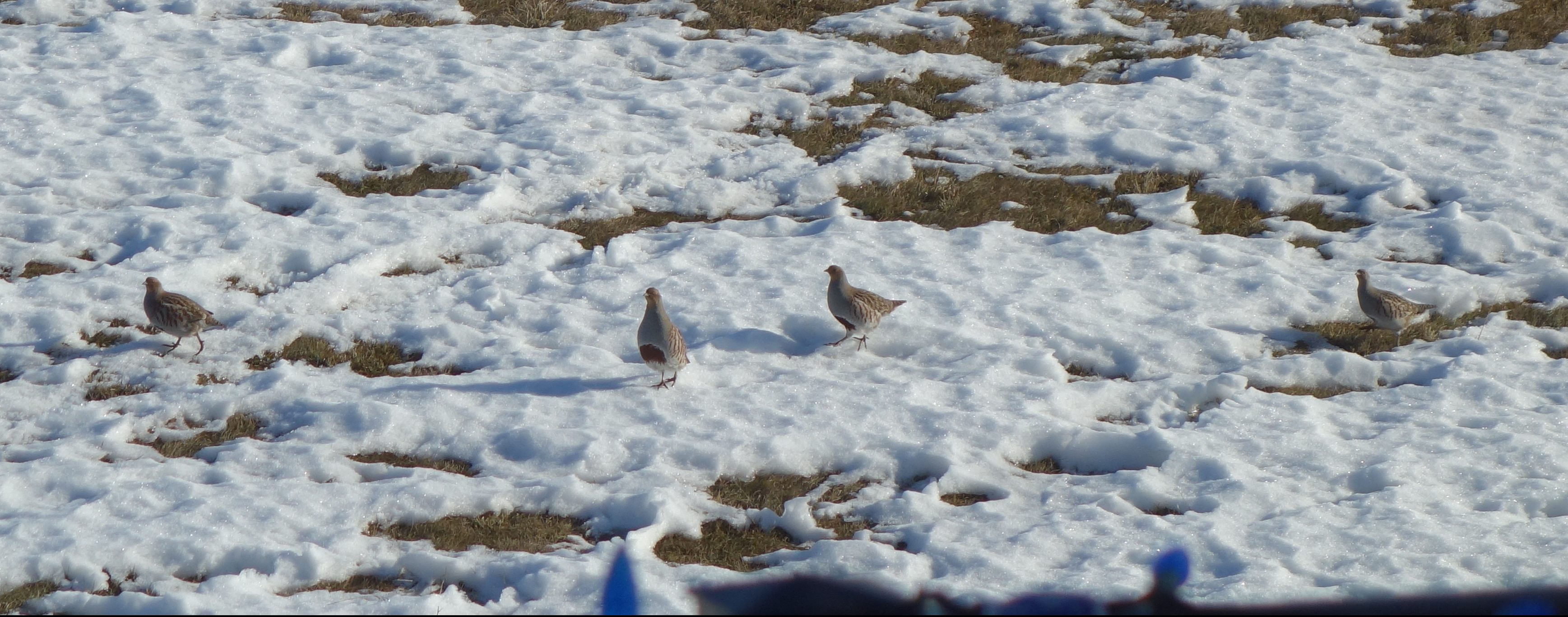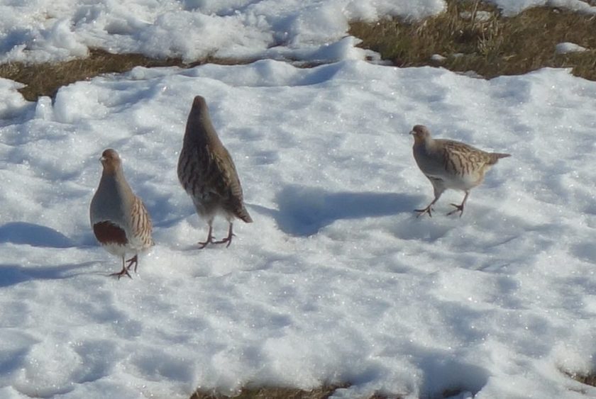 We had some cute little visitors this weekend: a small flock of Hungarian Partridges! They bustle along at quite a clip, (like birds in a animated feature) but paused long enough to nibble that I could get a photo of them. I think they are very sweet. They are also known as Grey Partridges, or Perdix perdix.