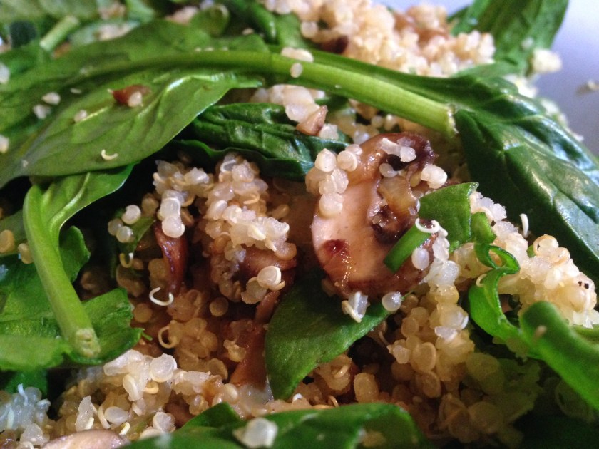 Melt 2 Tablespoons of the butter in a frying pan. Sauté the yellow onions until soft. Add another tablespoon of butter and the garlic and mushrooms and cook until everything is soft. Season with pepper and salt. Mix the mushroom mixture into the quinoa to distribute evenly. Toss the green onions and spinach into the mix and stir. I usually wait a bit to do this so that the spinach is not very wilted by the time it hits my plate.