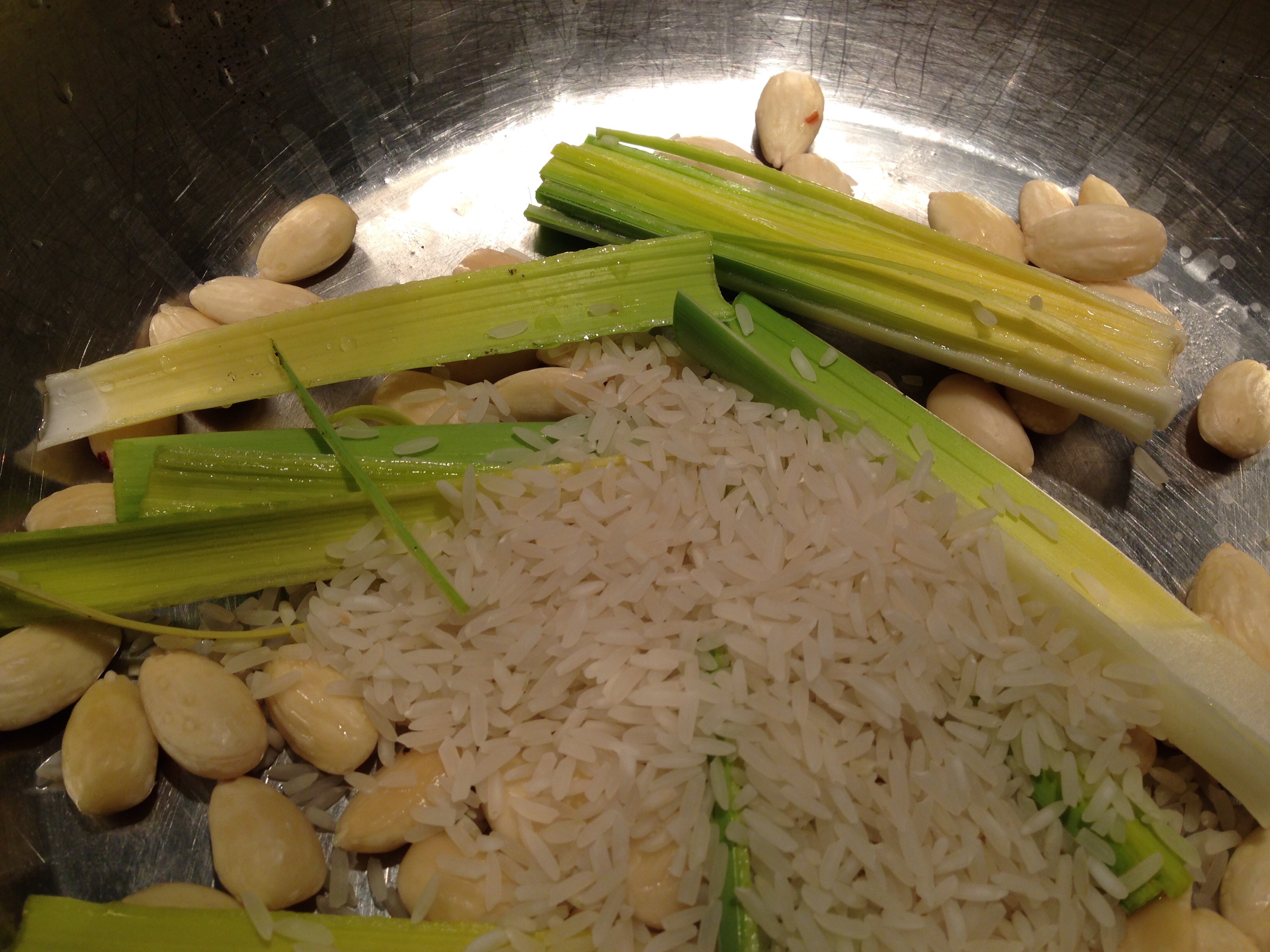 Pour the stock into a soup pot and add the almonds, rice and leek. Bring to a boil and simmer for 30 minutes. Let this cool enough to put into the blender (or, it can be put into the fridge at this point to be continued the next day if you are making it ahead).