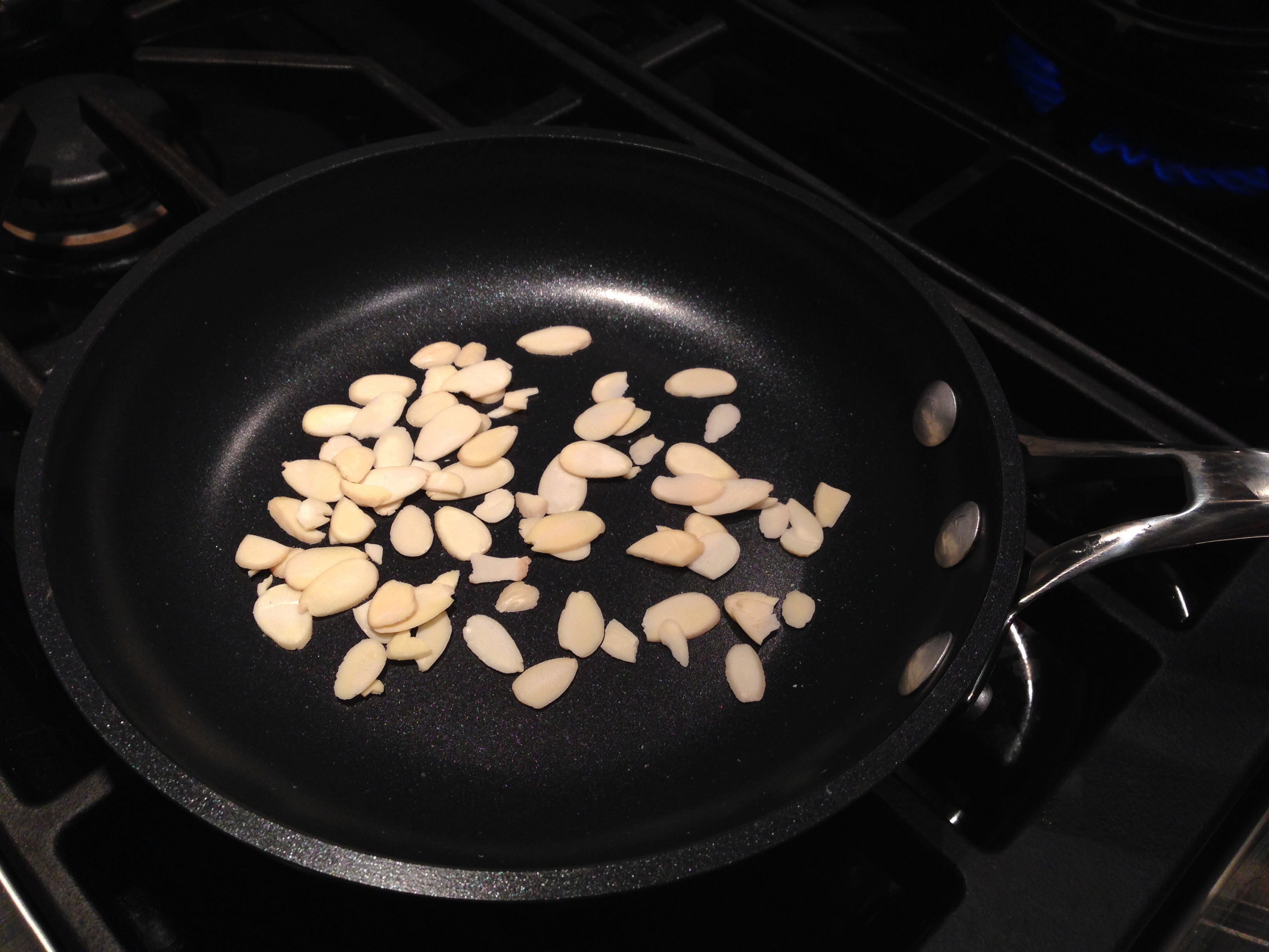 Place sliced almonds in a frying pan. Cook for a short time over medium heat. Toss them to toast the other side. This whole process will take 1-3 minutes depending on the heat of your pan. Do not walk away or you will have burnt almonds.