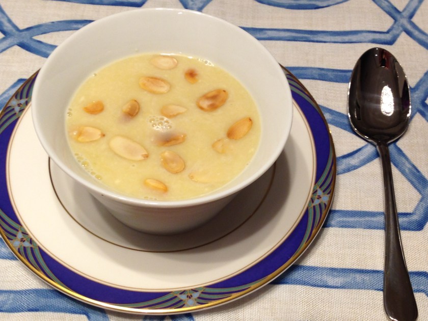 If you like almonds, this soup is a bit special and makes a nice first course for a dinner party, or maybe for your someone particular on Valentine’s Day. You can make most of it ahead (in fact it is better if you do) and just finish the last bits when you want to serve it.