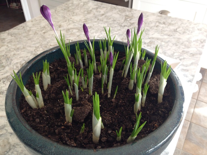 Here are my directions for forcing bulbs/corms. The photos below are of a pot of crocuses that I had chilled for 3 months and then brought into the warm house. I covered the soil with a dish towel and watered it every month. Patience in this area pays off quickly once they are brought indoors.