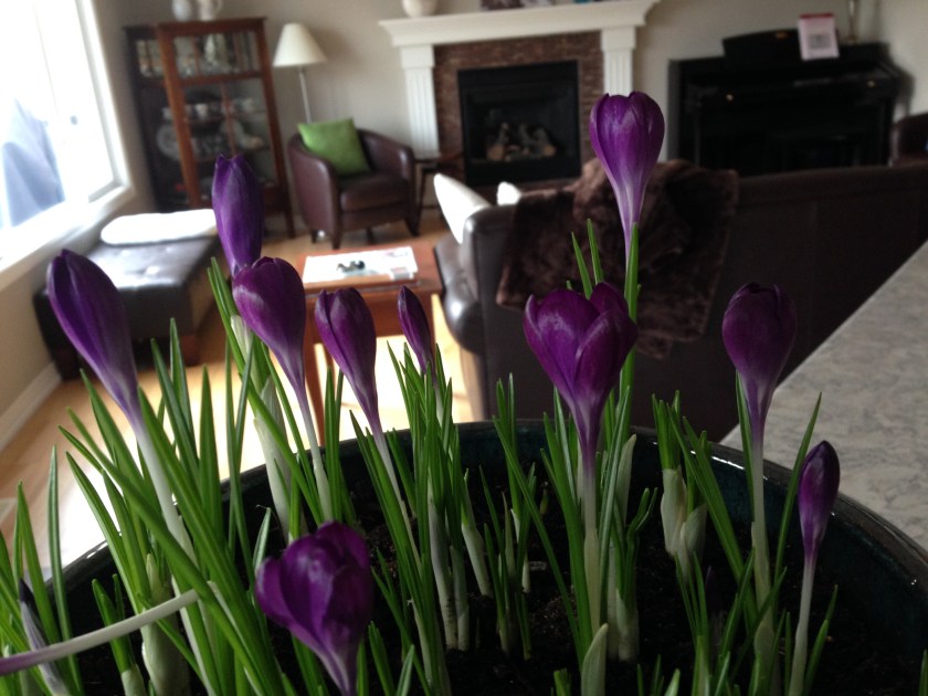 Feb 18 – already several flowers! I had to move the pot to the countertop as the cat thought they might be good for gnawing on…. Sigh…