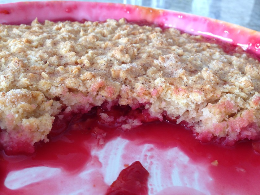 I love this cobbler recipe. It gives a crispy topping without using oats (I love oats too, but we have One Who Cannot Eat Oats in the family, so alternate toppings are a nice thing to have in my pocket. I made this one with sour cherries I had in my freezer, but you can use any kind of berry or soft fruit like plums or peaches instead.