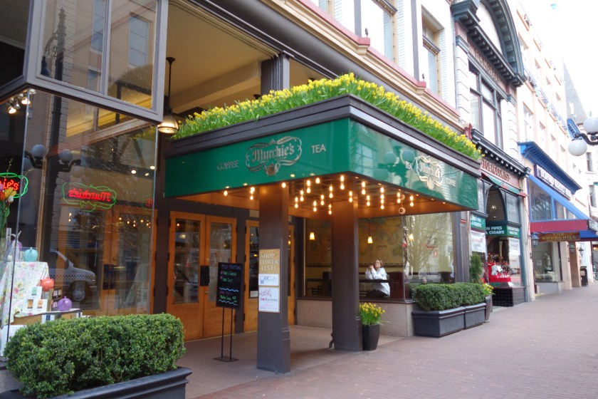 Murchie’s Tea House is a great place to refresh yourself while walking around Victoria. How can you not enter a place whose windows display colourful teapots, people enjoying tea and baked delights, and that has the roof of its entrance covered in a carpet of daffodils!  How appealing!