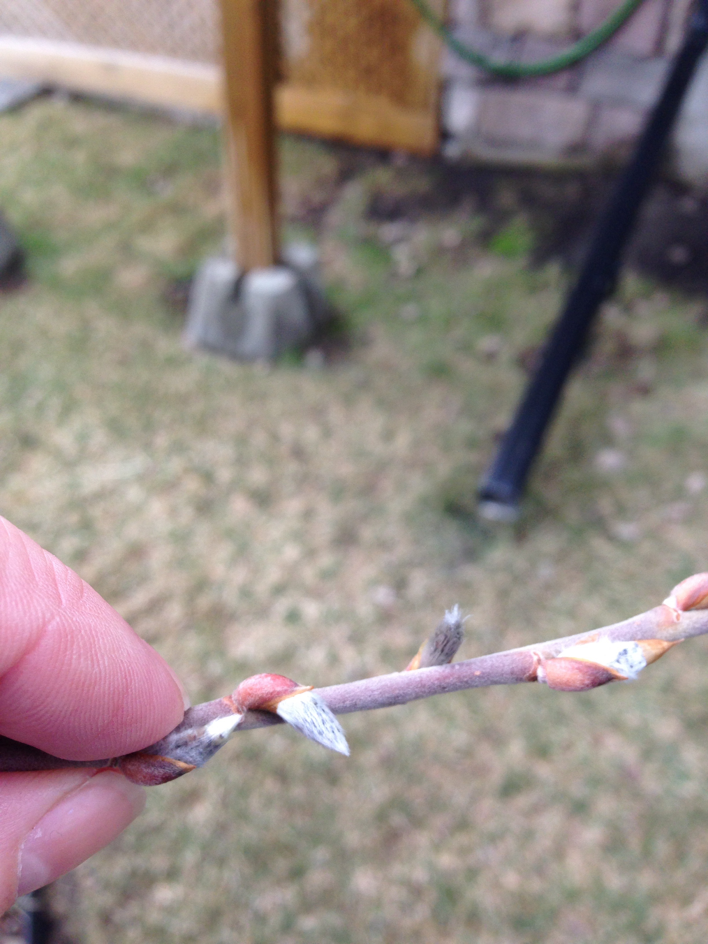 Since we moved into this house pretty much at the end of the growing season last year, I have been looking forward to spring here. We had a big hailstorm just before we moved and the previous owners cut all the damaged plants back to the ground. I was able to identify a couple of them by smell, but I have been looking forward to spring when everything puts its flashy bits on display, making them easier to identify. For example, I figured we had a few willows by the shape of the remaining leaves, but they are producing little catkins, so Pussy Willows they are! While I was digging grass out of the beds and getting to know my soil (there are lots of worms and ladybugs, yay) I discovered the first leaves of what looks like bellflowers of some sort, as well as daffodils, scilla, daisies, bee balm, and a marker for dwarf phlox (we’ll see if it shows up). I did notice that none of these plants are on the “favourite salad bar items of deer” menu. That bodes of things to come, and I’ll try to carry on that tradition. The little shrubs cut to the ground are still a mystery – gardening is a sport requiring patience. It is intoxicating to sit in the sunshine and root around amongst the plants though. For me, there is nothing like the feeling of spring! I’m itching to hit the garden centres, but I know it is too early unless I want to spend the next month carrying pots in and out of the house. I did notice that my sweet peas have germinated though, so we are in business there!