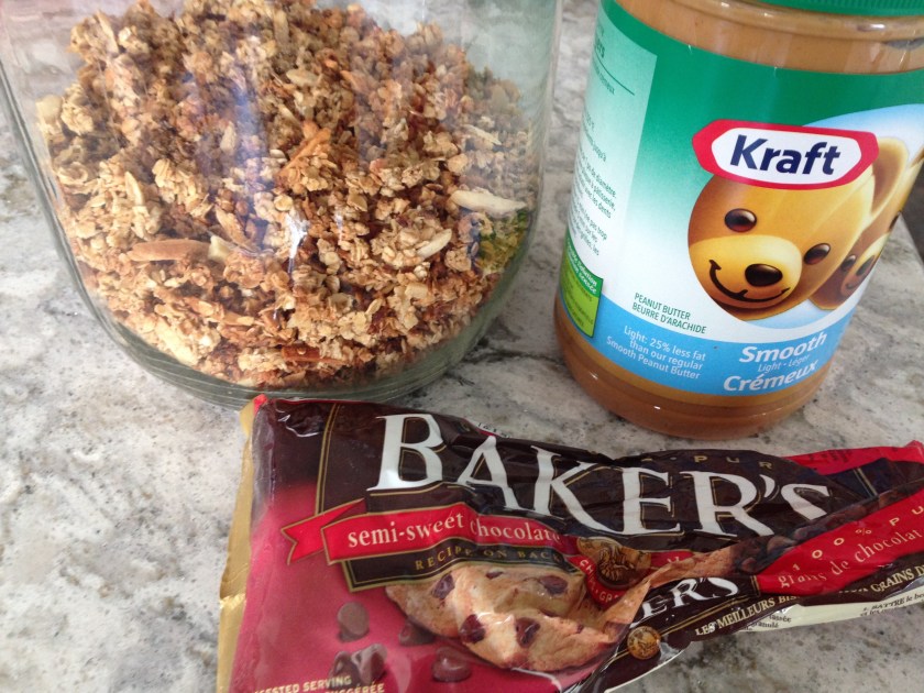 Line a bread pan with parchment, leaving it hang over the edges so you can remove the whole thing to slice easily. Melt the peanut butter and chocolate together. (I did 90 seconds in the microwave). Add the granola to this and stir until it is evenly mixed. Pour onto the parchment paper, spreading evenly.