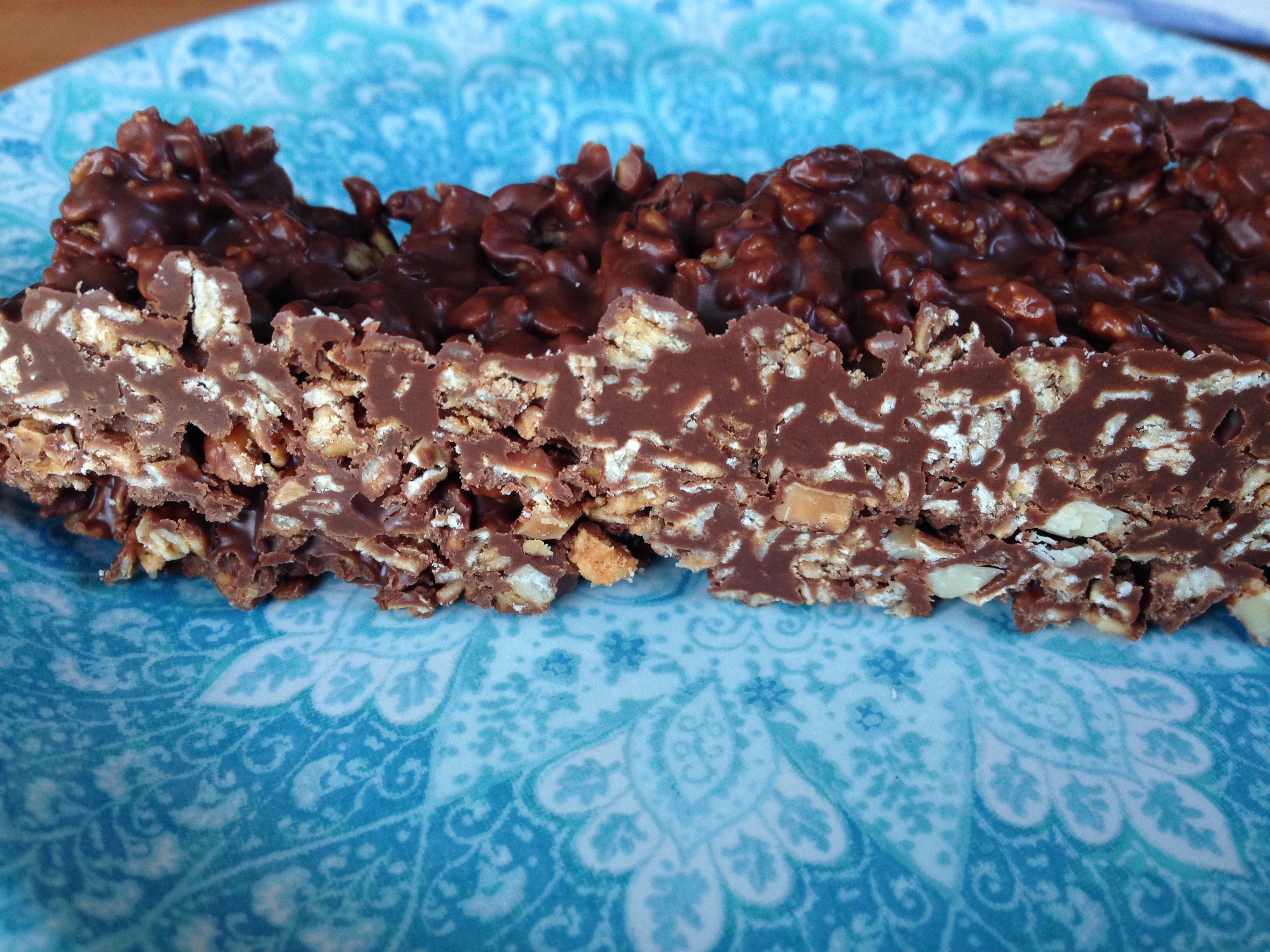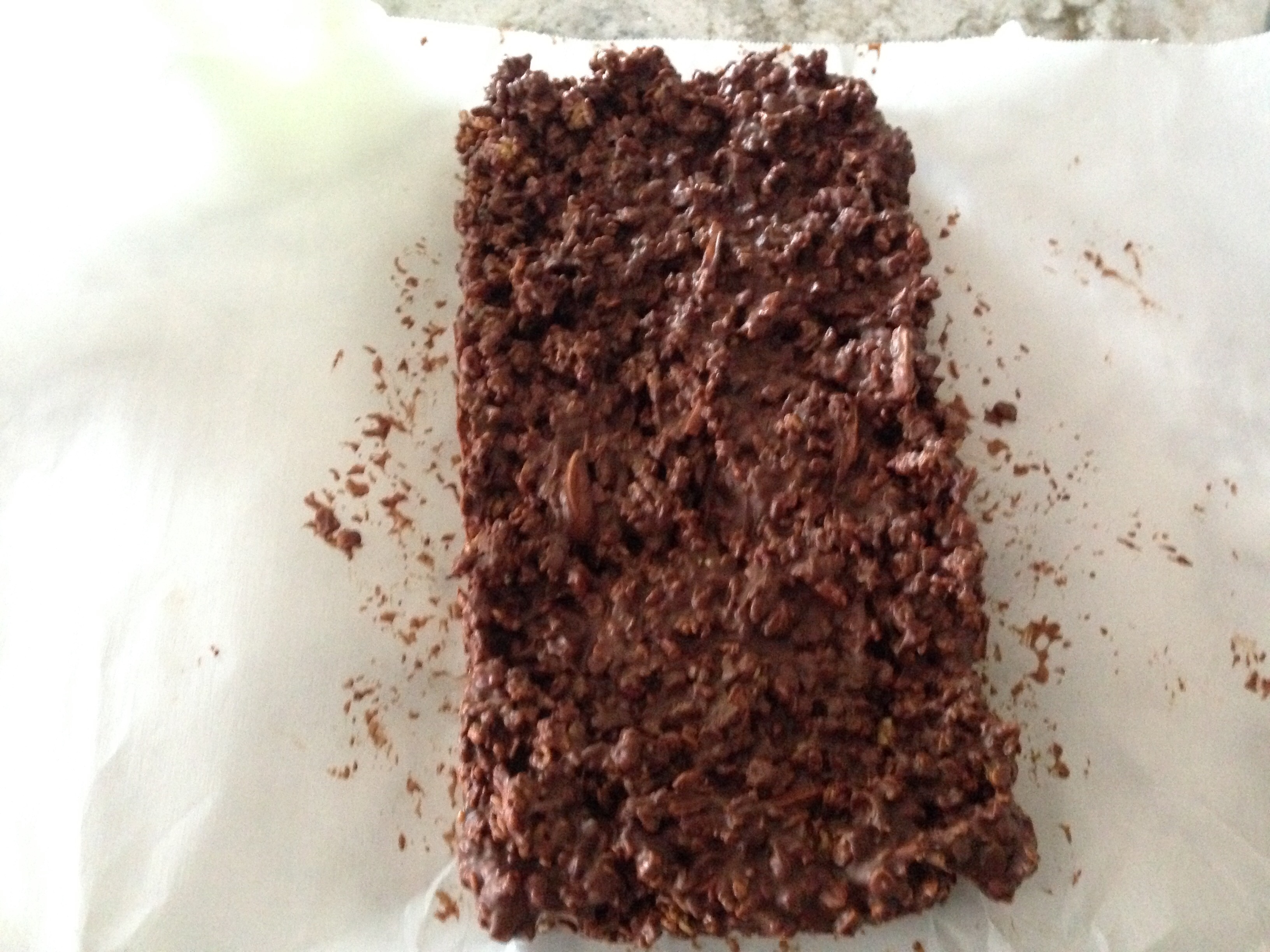 Line a bread pan with parchment, leaving it hang over the edges so you can remove the whole thing to slice easily. Melt the peanut butter and chocolate together. (I did 90 seconds in the microwave). Add the granola to this and stir until it is evenly mixed. Pour onto the parchment paper, spreading evenly.