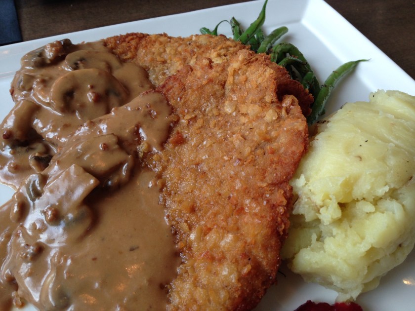 For mains we had Jaeger Schnitzel and garlic mashed potatoes. Going out, on occasion, gives me lots of inspiration for foods to try to make at home! And…I brought enough home for two days of lunches! Happy Mother’s Day to me 🙂