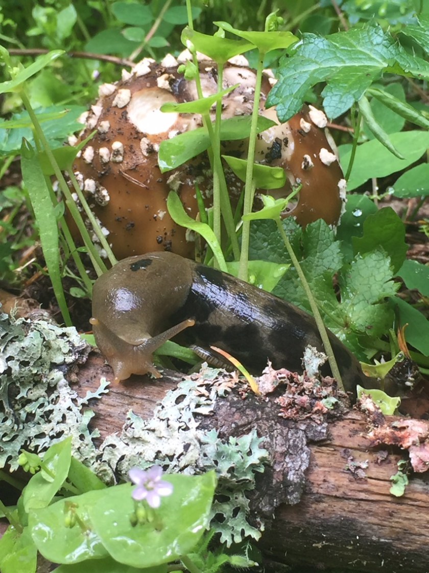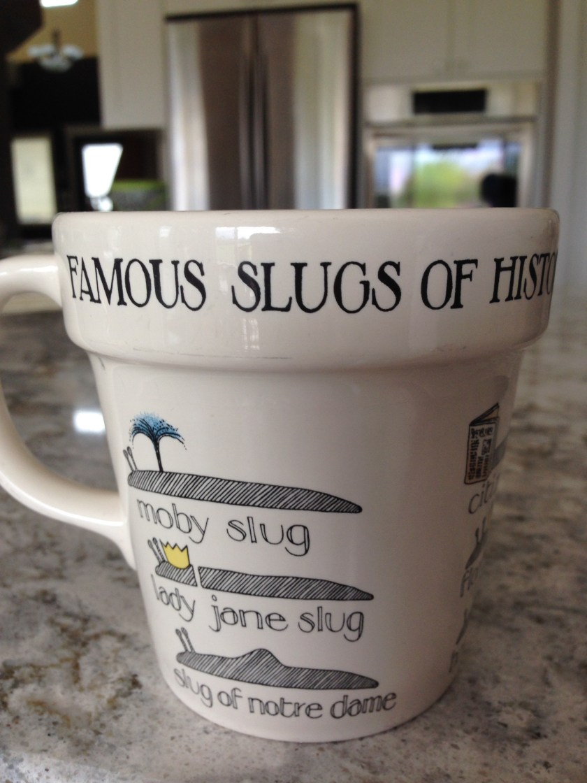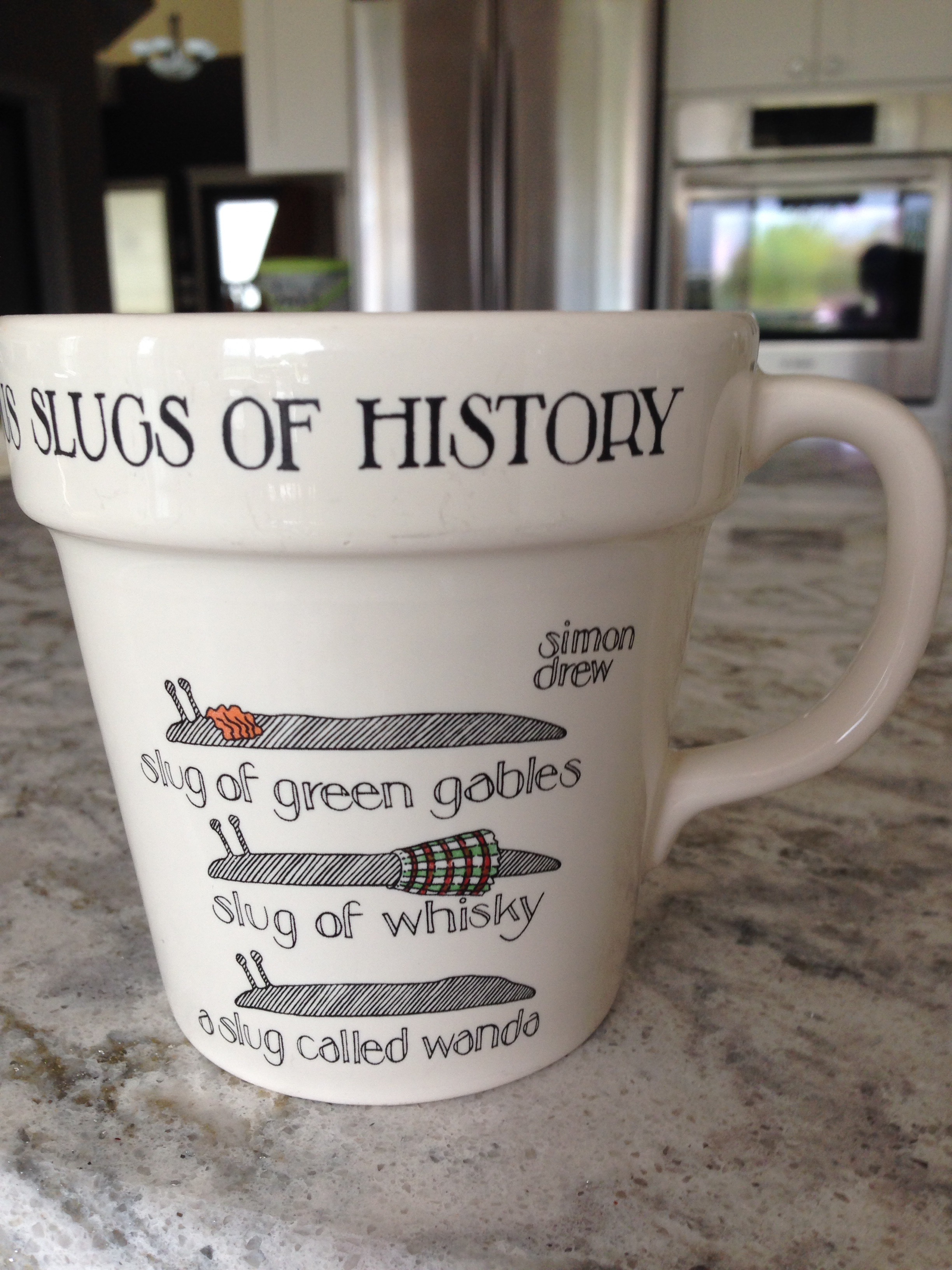 My youngest has been visiting her aunt in Duncan, British Columbia for the past couple weeks. During a nature walk she sent me these photos of mushrooms and slugs from her phone. Why slugs you ask? Firstly, she is a zoology student, and secondly, scroll to the bottom and see the mug she has been drinking from since she was a wee one…