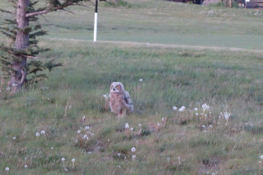 I then discovered what it was looking at, namely the two fluffy owlets on the ground. I am astounded that a bird can look so adorable while staring in an intimidating fashion.