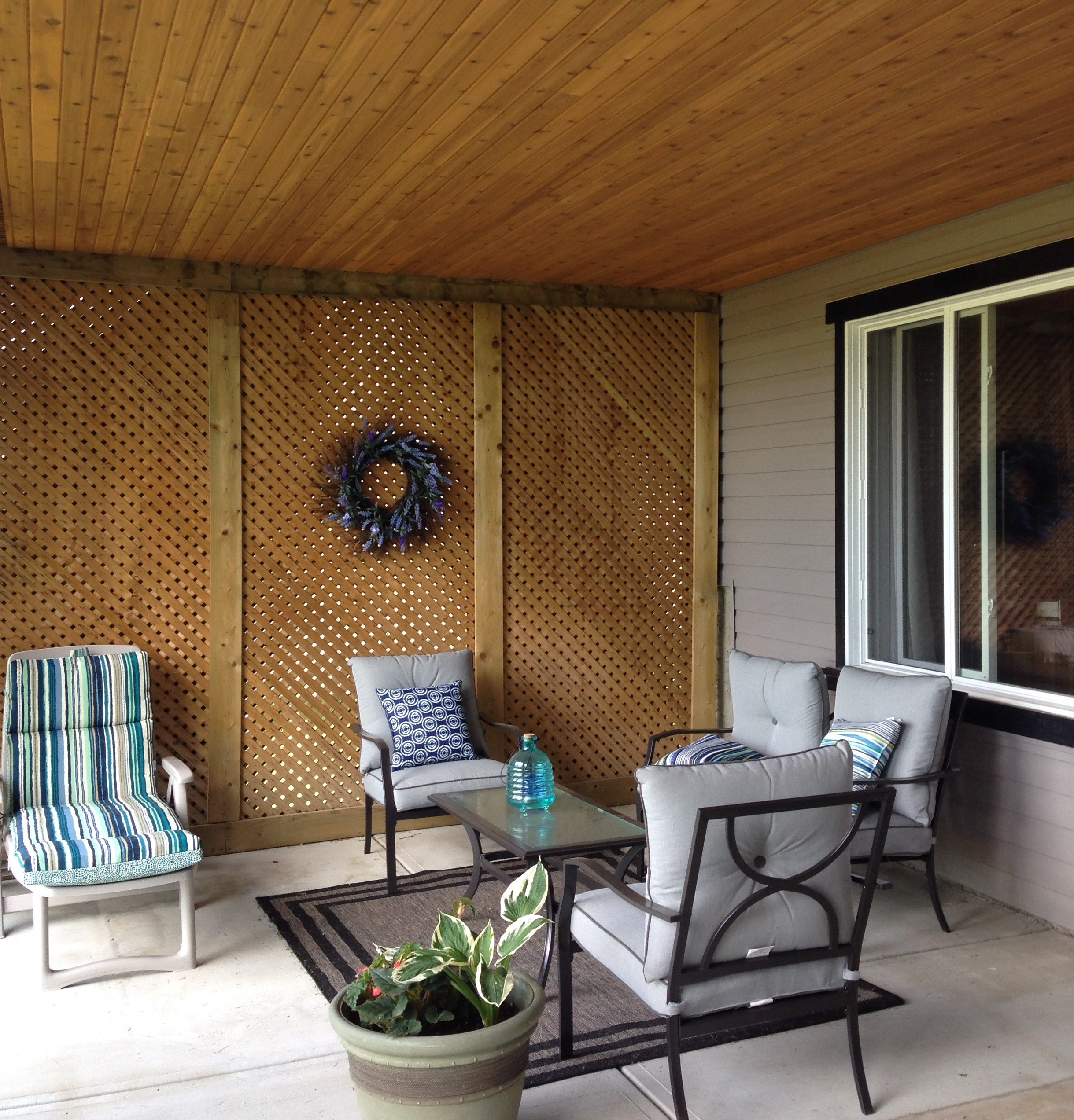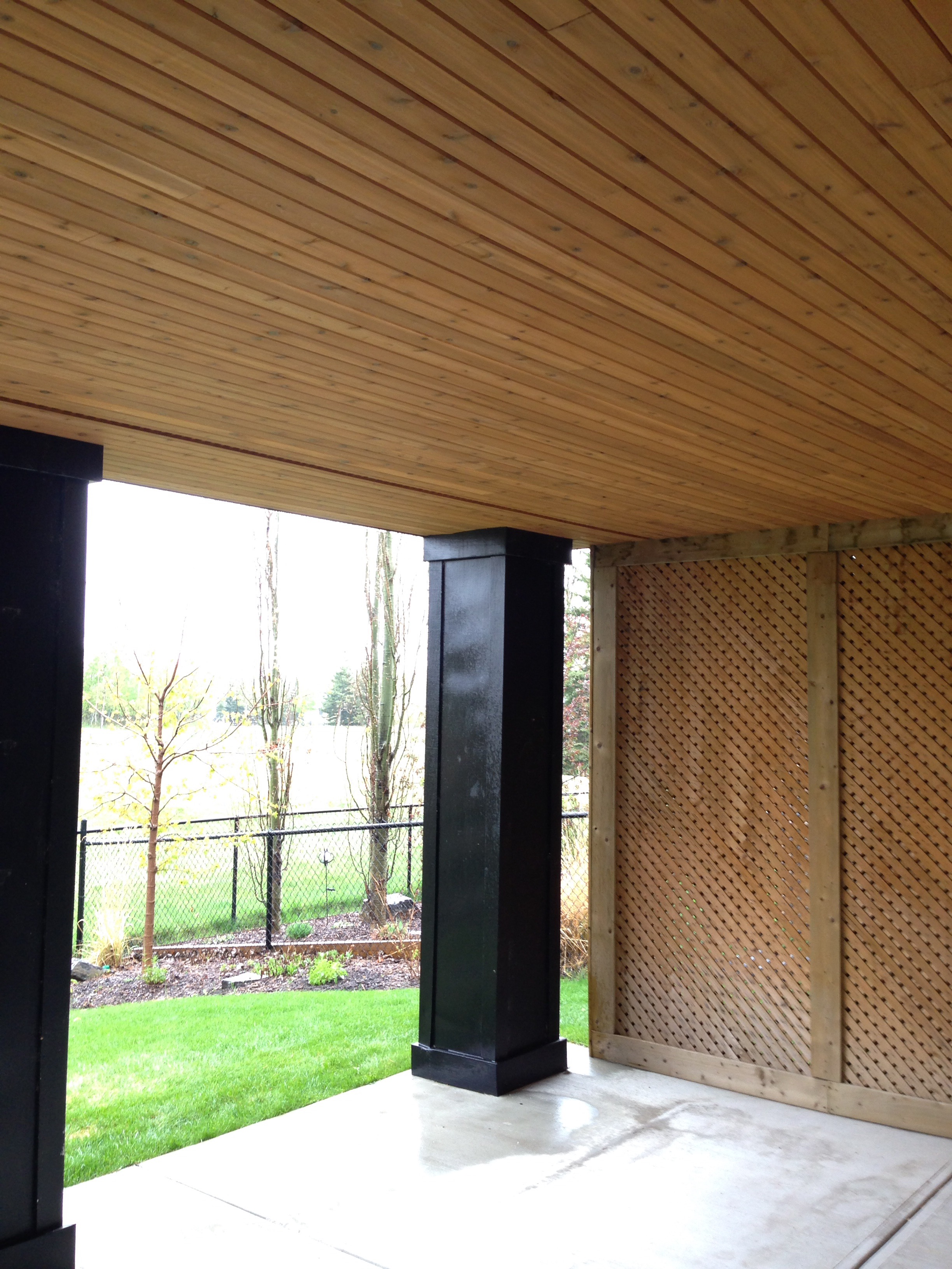 I like the look of the cedar, and as a bonus, having it covered in will deter “those who like to nest” from taking up residence above us.