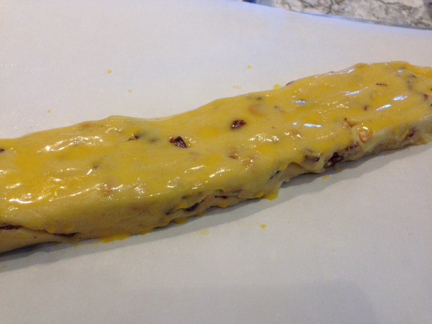 Divide dough into 4 pieces. Shape piece into 9x2x1½-inch logs. Place logs 4 inches apart on two cookie sheets with parchment. Stir together 1 beaten egg yolk and 1 tablespoon milk. Brush egg mixture over logs.
