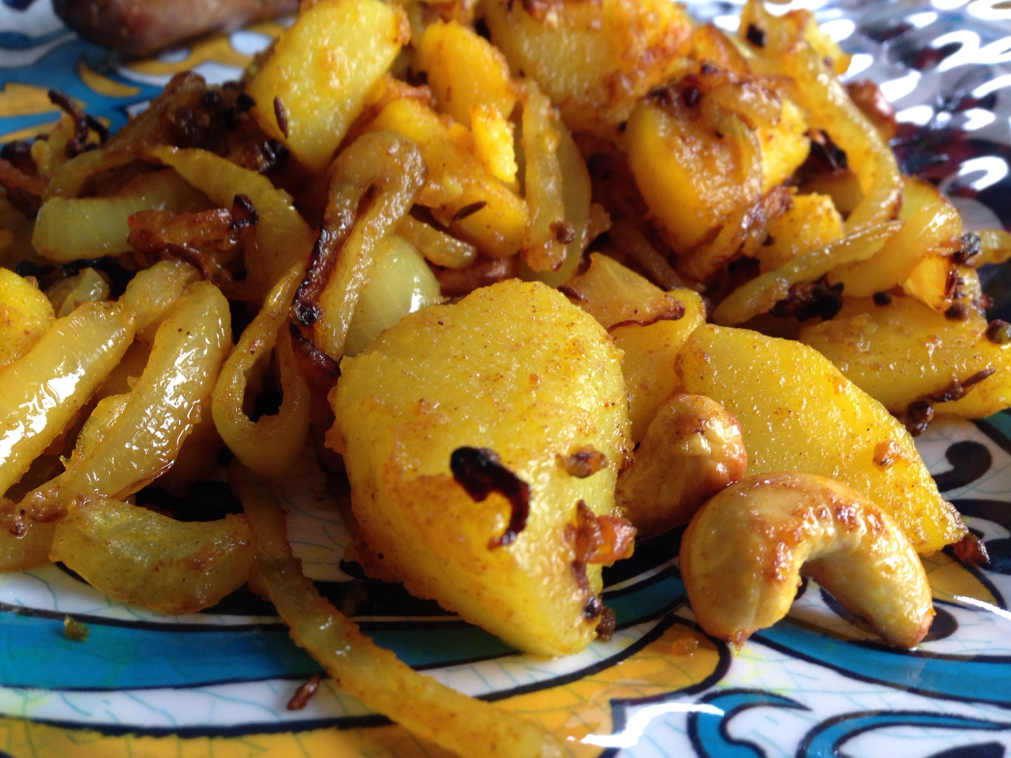 Heat the oil in a frying pan, add the mustard and cumin seeds, covering with a splatter screen. When the seeds stop popping. Add the cashews and onions. Cook over medium heat until the onions soften, stirring to keep the cashews from burning. Combine the turmeric, deggi mirch, salt and sugar in a bowl and sprinkle some over the onions. Add the potatoes and sprinkle the rest over those, tossing to cover them evenly. Continue heating until evenly warm. You can give them a squirt of lime juice at the end if you like, but they are just as good without.