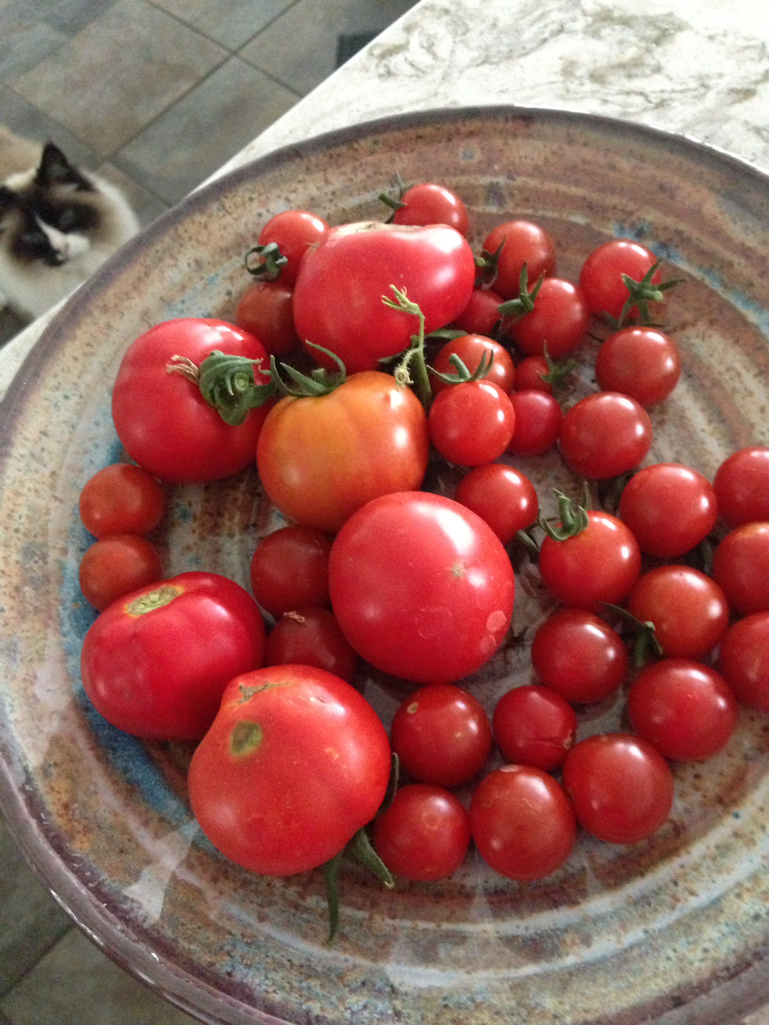 Our tomatoes are ripening! They are so sweet and delicious. Our cat thinks they make very fine rolling toys and is hoping another one falls off the plate…