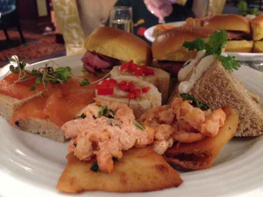 We took my husband’s mother and her husband to the Palliser Hotel in Calgary for Tea on Saturday. They have an Indian themed service for the fall with Tikka Masala chicken sandwiches, spiced shrimp on crispy naan, ginger scones with mango jam etc. Different, and something nice to do with the folks.