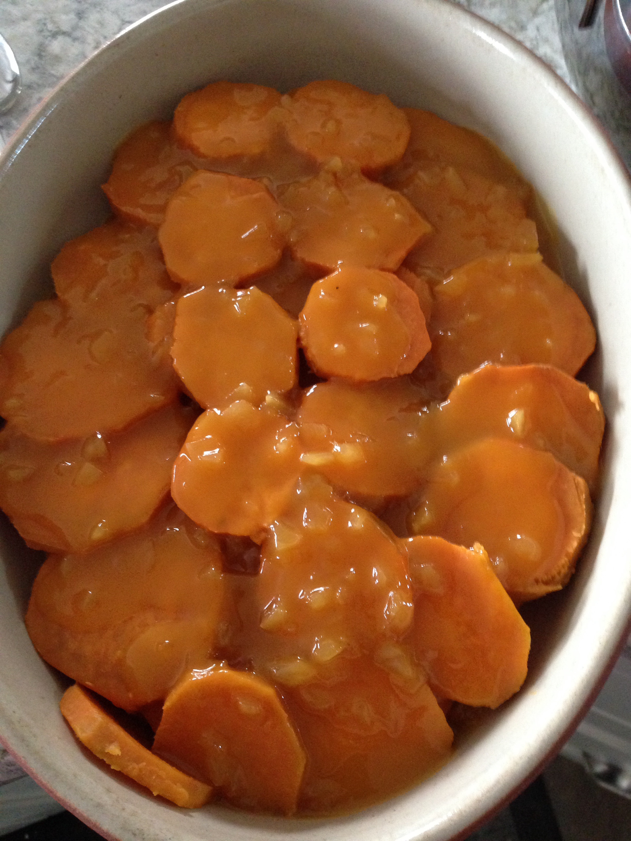 Peel and boil sweet potatoes for about 20 minutes or until soft. I usually cut the large ones in thirds before boiling. Meanwhile, juice clementines until you have 1 cup of juice. In a pot, combine the juice, cornstarch, sugar, ginger, syrup and butter. Heat, stirring until it comes to a boil and thickens.
