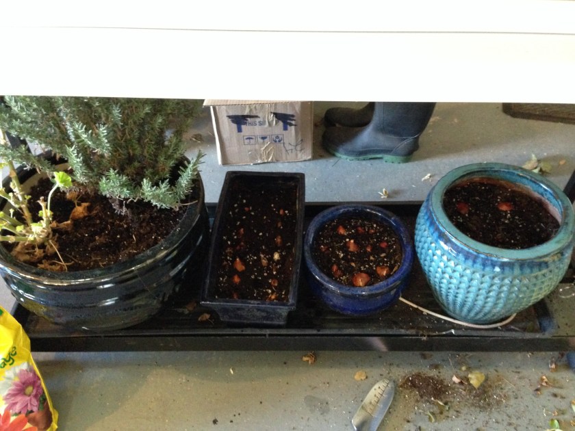 I finished planting my tulips to force in the garage this winter. I just need to finish the clean up and cover the pots with old towels to keep them darker. I did 5 kinds in 4 pots so we should have a nice display when I bring them into the house in January/February. I am also trying to overwinter a couple potted roses and a lavender plant in the garage as well. We keep the garage just above freezing over the winter, so it should work…yes?