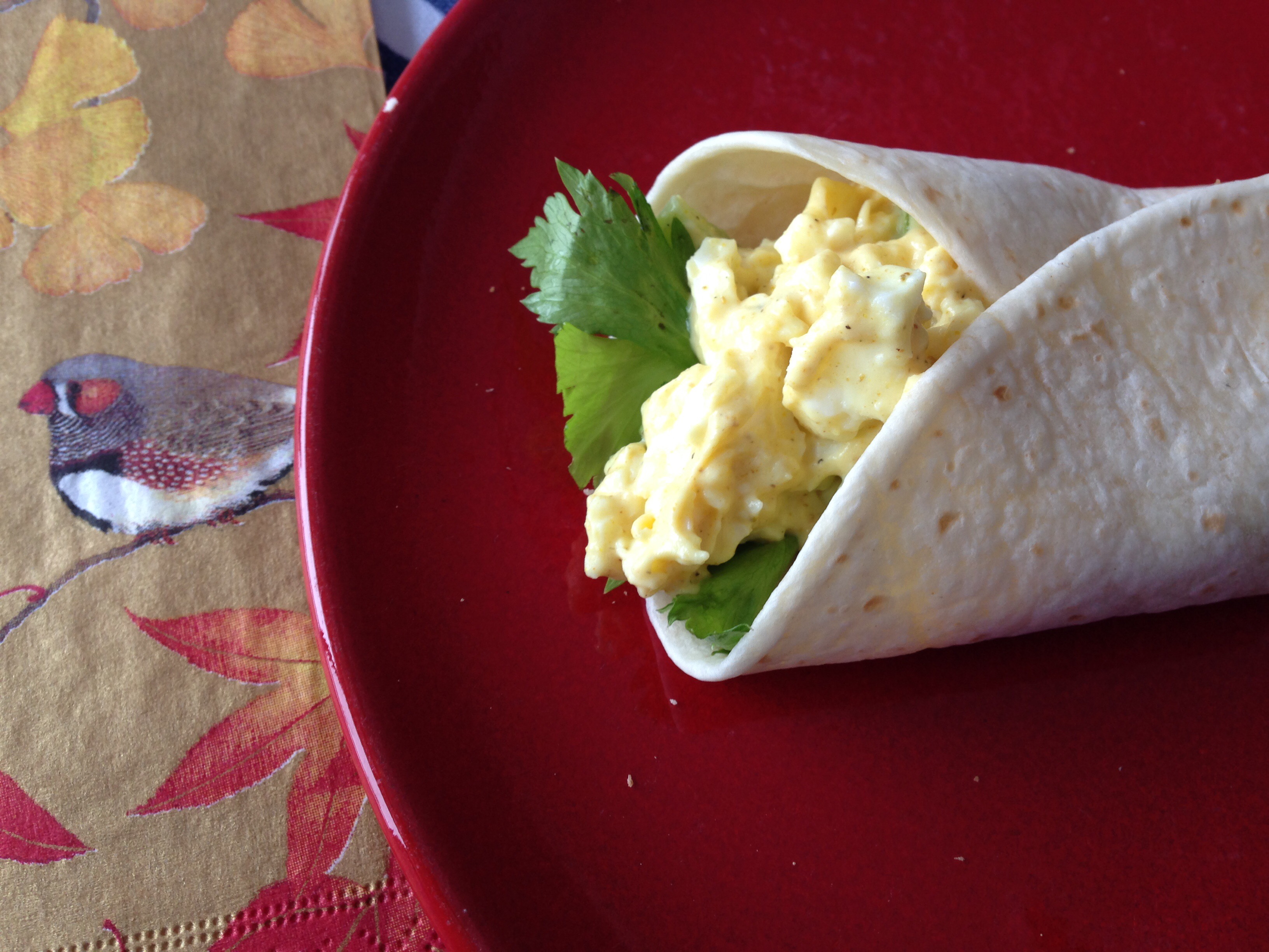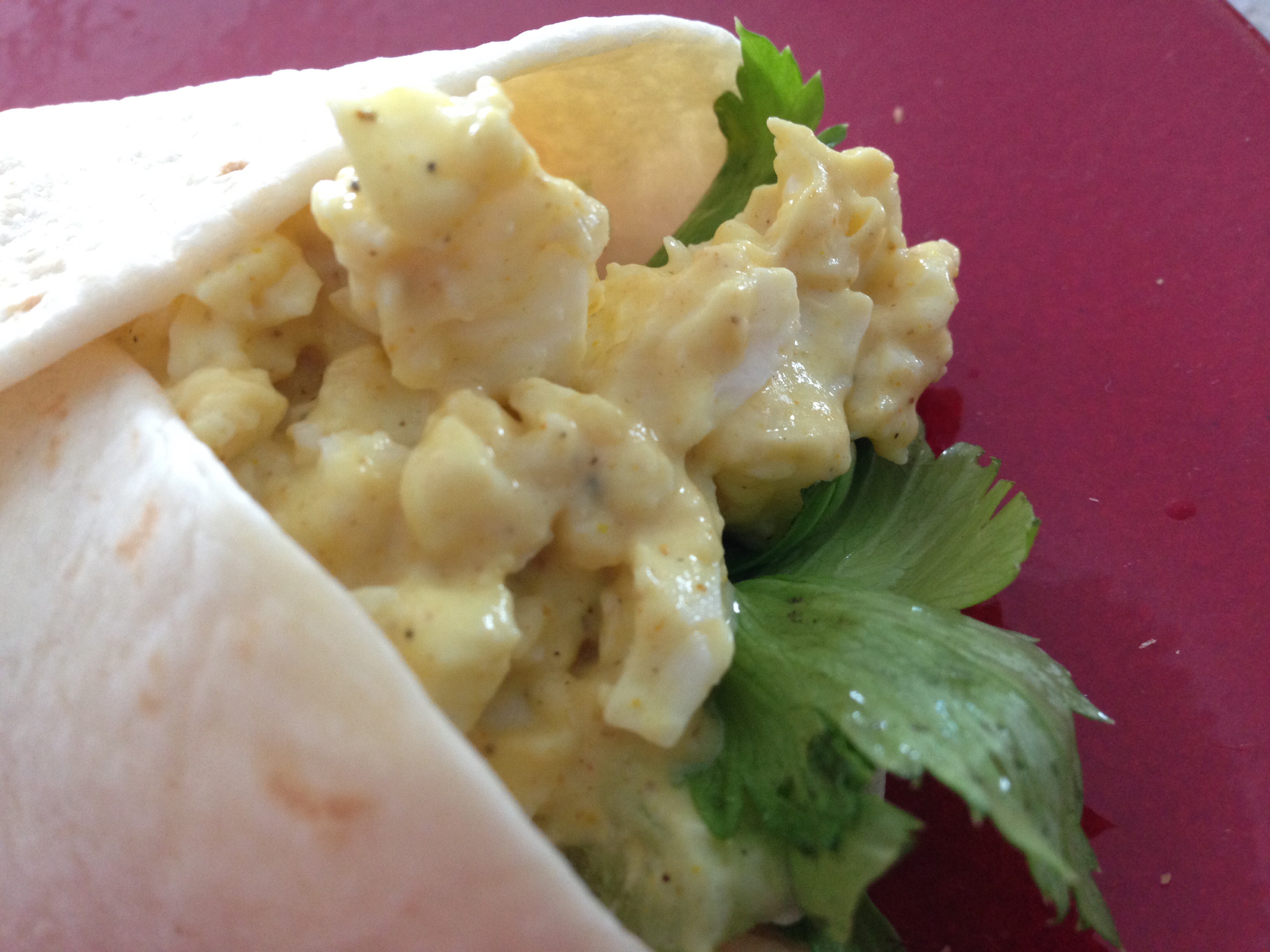 Mash up the eggs and add the mayo, mustard, curry, salt, pepper and celery. Place spinach or celery leaves down the middle of your tortilla, top with egg mixture and roll.