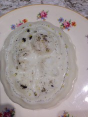 I used the panne cotta recipe from The Kitchn in two separate attempts. The first one, I used the mix of whipping cream and milk as printed, but used a vanilla bean to flavour the milk in the heating process. I expected that the little seeds would be distributed thoughout like little speckles. I should have thought that through better because all the seeds settled perfectly into the shapes at the bottom of the mold! It looked like I gilded it with coal dust. Oh all right, I’ll show you…. The yellow dots are oil used to lubricate the pan. Not the most attractive. The flavour was fantastic using this method though, and we covered the seeds with raspberry sauce and thoroughly enjoyed it. It also came out of the mold perfectly.