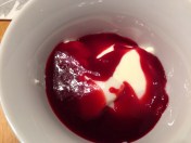 I made the raspberry sauce by combining 3 cups of frozen raspberries and 1 cup of sugar. I heated that up and strained the seeds out. Added a bit of corn starch slurry (1 tsp. cornstarch and 4 tablespoons of water) to the cooled juice and heated it up again to thicken it. It needs to be cool before serving.