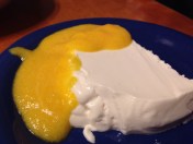 On my second attempt I used all half and half cream as she recommended in her recipe notes, to keep the cream and milk from separating as the dessert cools in the mold. This worked really well. I decided to just use the amount of vanilla extract she had in the recipe though and found the flavour sadly lacking. Also, I didn’t use as much oil in the mold so it didn’t unmold as cleanly – I lost a couple roses to the attempt. I served it with peach sauce the second time.