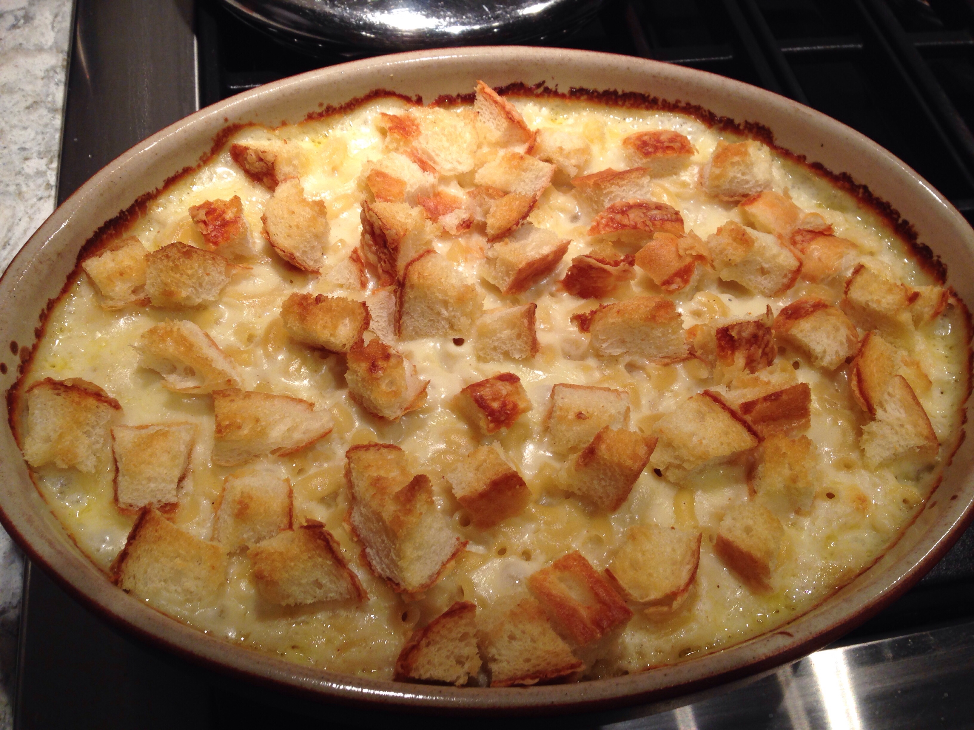 Make a cheese sauce in the sauce pan by melting butter, stirring in flour and giving it a quick cook. Slowly add milk, whisking in as you go to get rid of all flour lumps. Simmer until sauce just starts to simmer. Remove from heat and stir in the grated cheese. Pour noodles and sauce into a casserole. Sprinkle bread cubes on top. Bake in an oven preheated to 350 degrees F. for about 30 minutes.