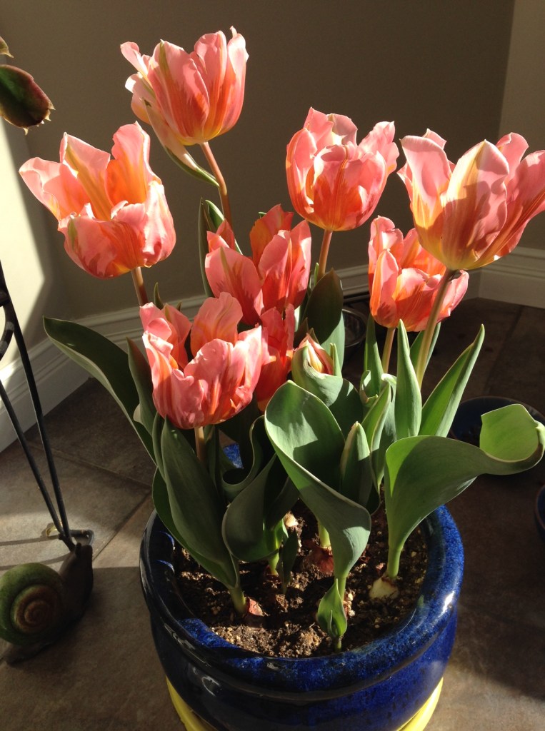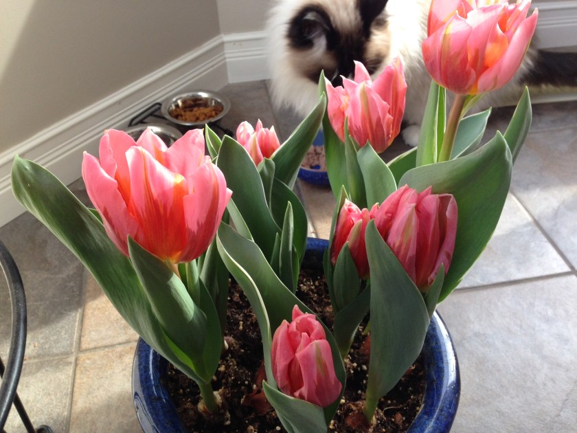 My indoor tulips are beginning to bloom in force now. I’ll post photos of different ones each Tuesday until they are finished blooming so you can enjoy them as well. These ones are “Pretty Princess Triumph” tulips.