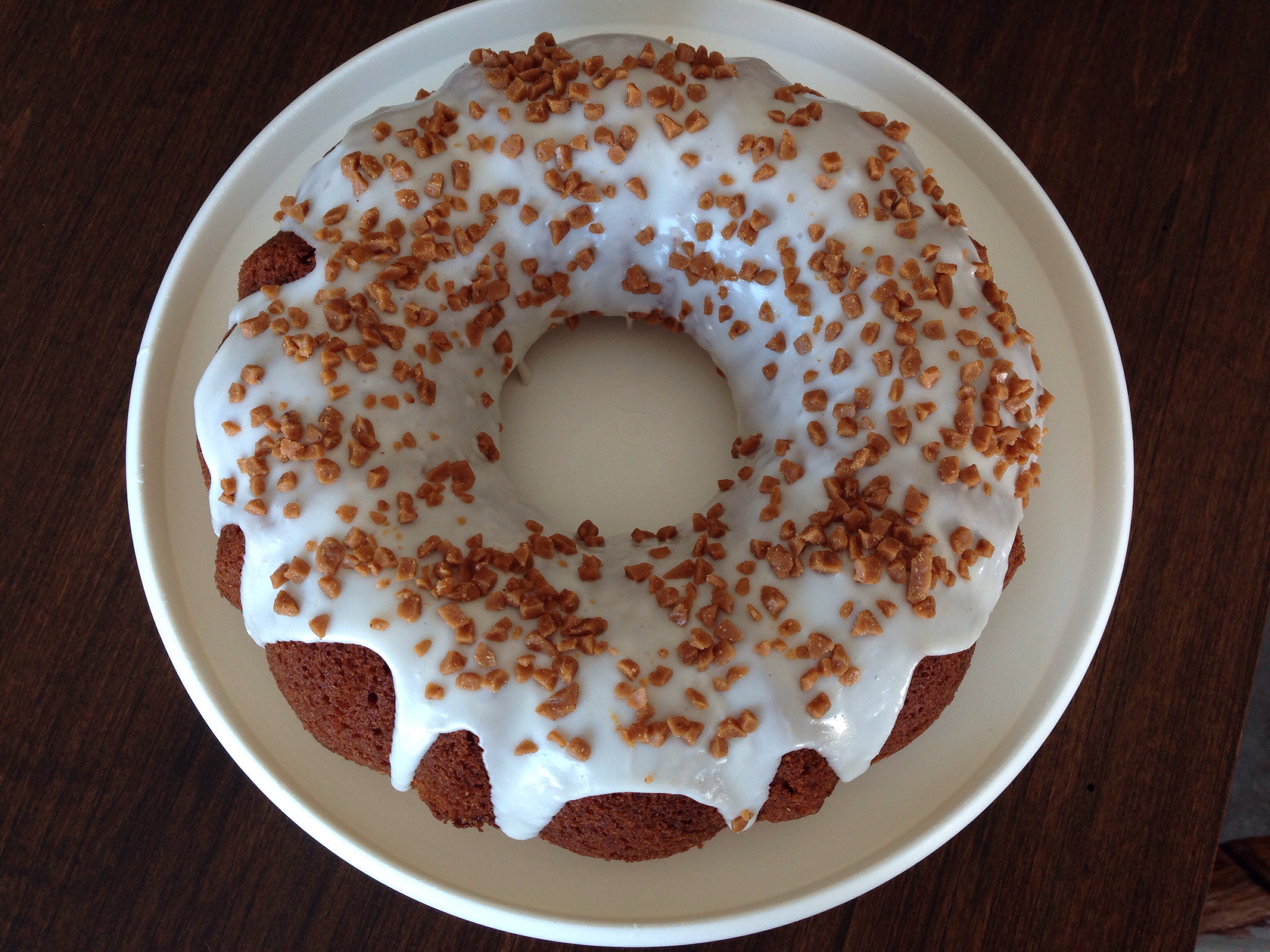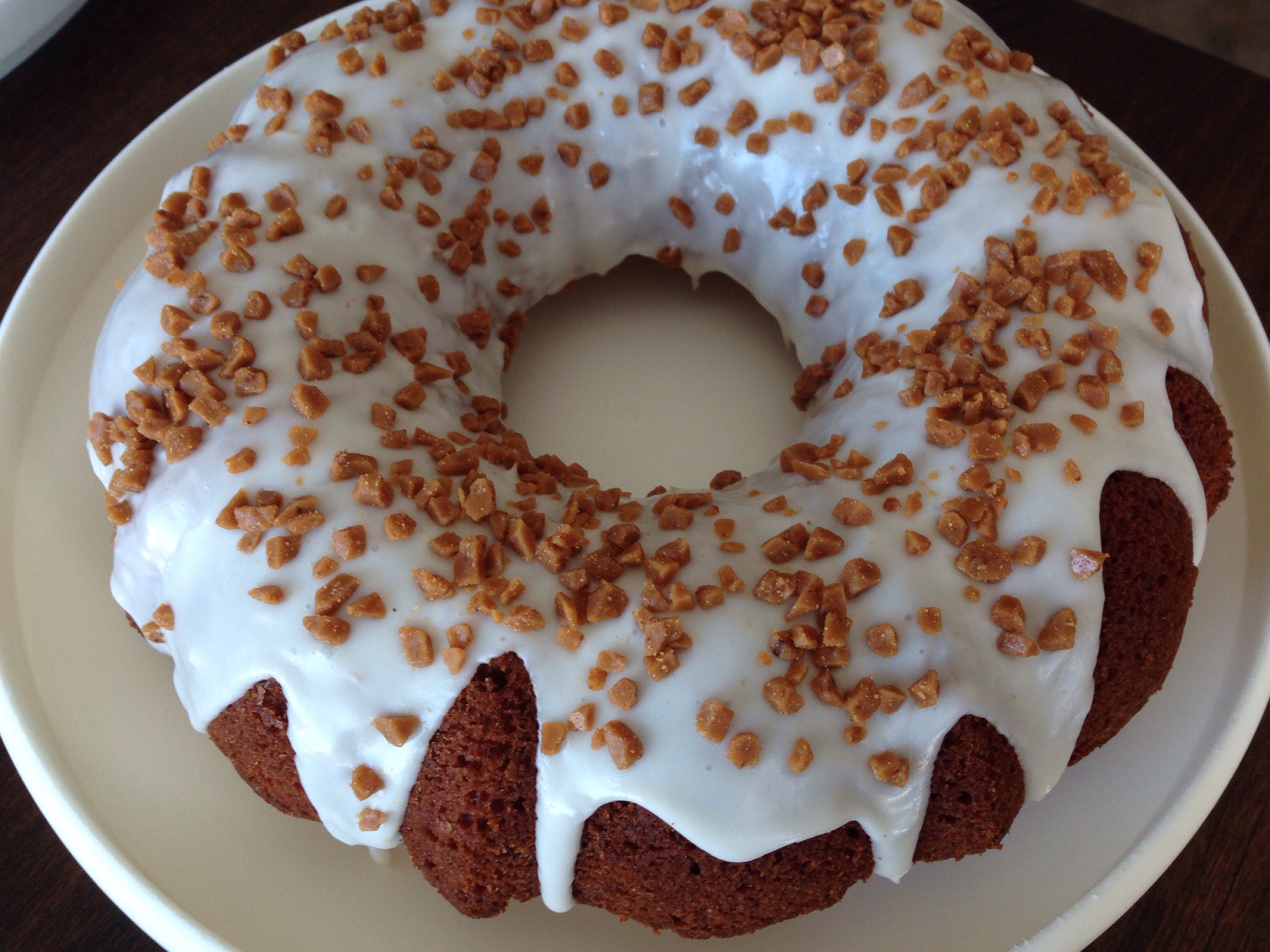 When bringing a cake to a potluck, I prefer to bring a sturdy bundt cake, rather than a layered, butter-creamed confection that might slide around in the car. Bundt cakes are good travelers. I had some toffee in my baking bin and decided to add them to a spiced pound cake recipe. As it turns out, I forgot to add them to the batter, but I did remember to top the cake with them, so have not completely lost my intention!! This cake does not completely fill the bundt pan and is nice when you don’t want a massive cake.