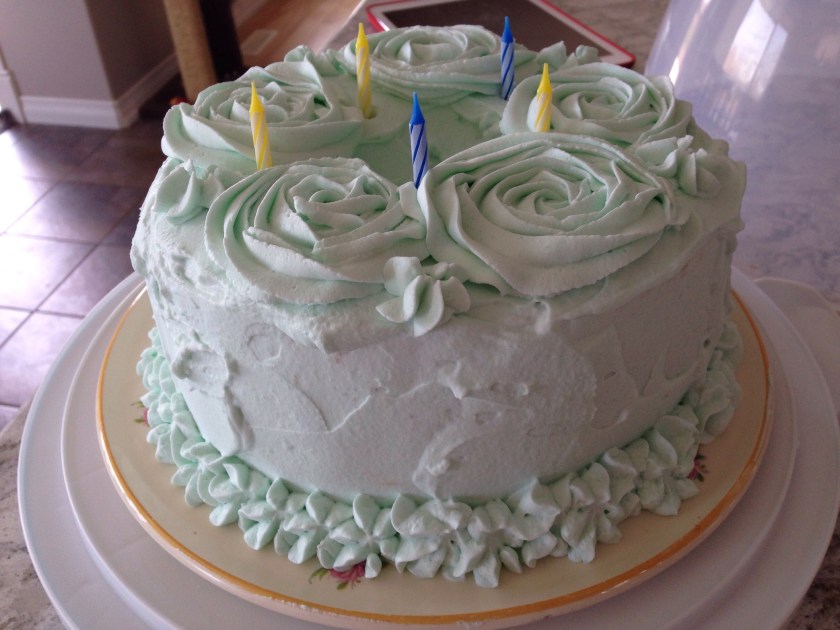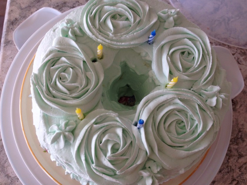 This is a really simple whipped cream “icing” that we particularly like for angel food cakes as it is light and airy as well. It has only three ingredients – whipped cream, jello powder and icing sugar. The icing sugar stabilizes the whipped cream so it doesn’t get runny and is easy to pipe. Strawberry jello is my favourite flavour to make this with, but other flavours are good too. This one is made with “blue fruits” flavour. This makes enough to cover and decorate an angel food cake.