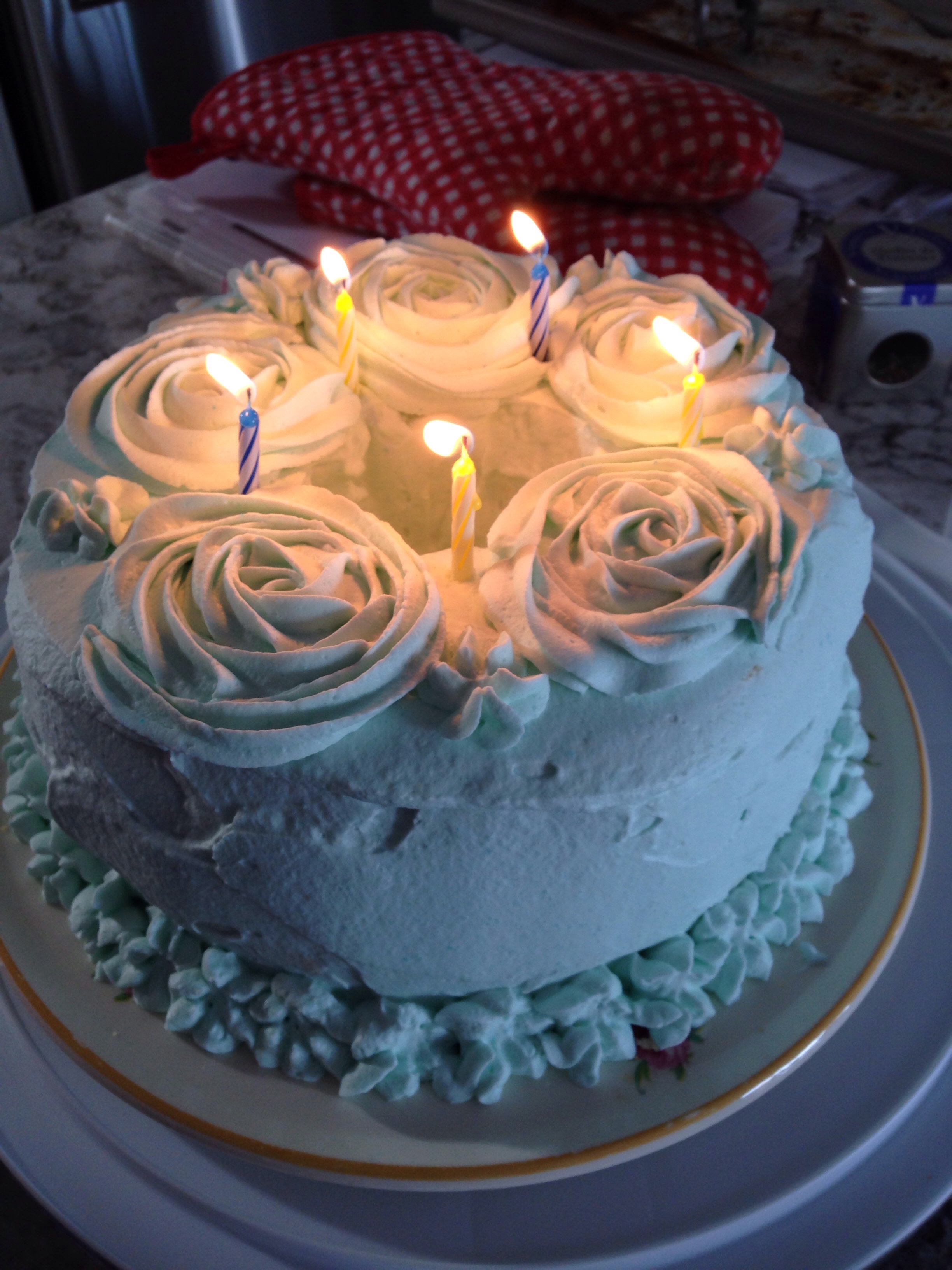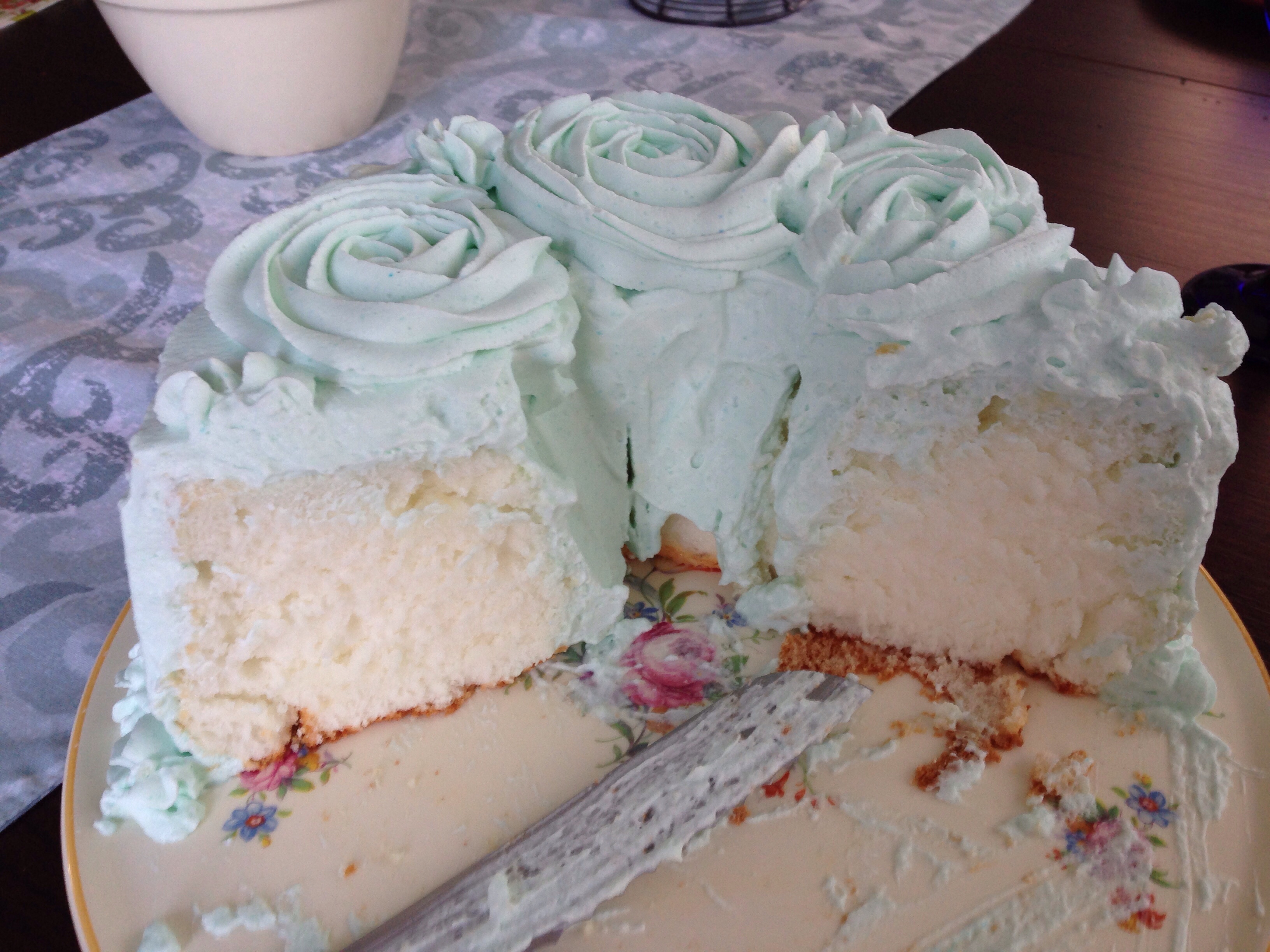 This is a really simple whipped cream “icing” that we particularly like for angel food cakes as it is light and airy as well. It has only three ingredients – whipped cream, jello powder and icing sugar. The icing sugar stabilizes the whipped cream so it doesn’t get runny and is easy to pipe. Strawberry jello is my favourite flavour to make this with, but other flavours are good too. This one is made with “blue fruits” flavour. This makes enough to cover and decorate an angel food cake.