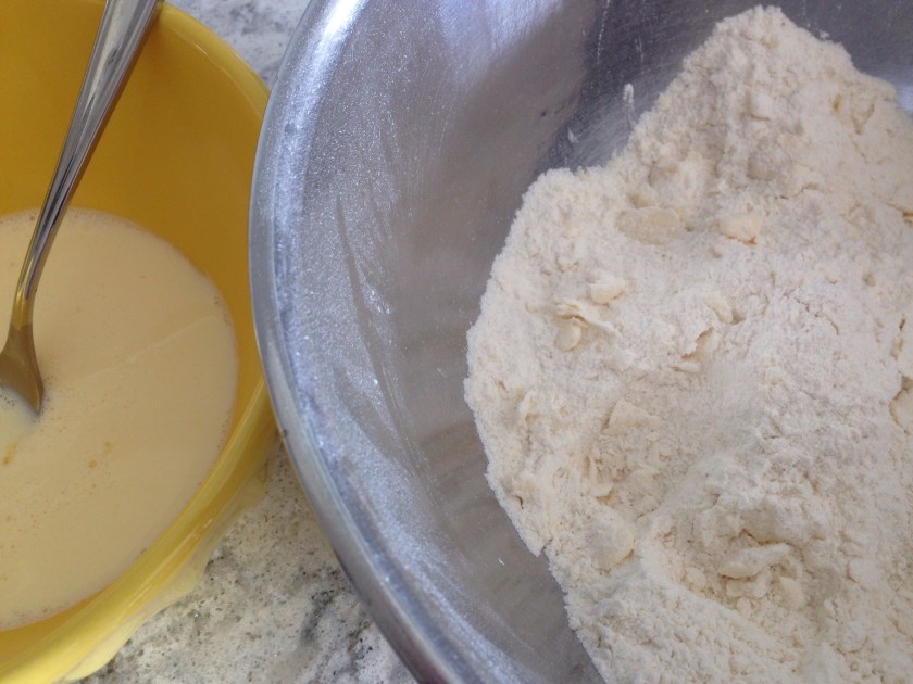 Beat the egg with a fork and add the cream. Stir into the flour and butter mix. Once the liquid is mixed in, use your hands to bring the dough together. Don’t over mix, just work until combined and add:
