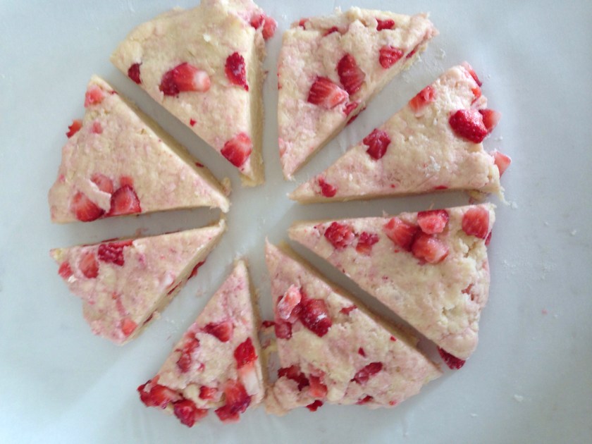 Place a sheet of parchment onto a baking sheet. Pat the dough out until you have a circle 6-7 inches in diameter. Cut into 8 pieces and move them slightly apart from each other. Sprinkle the tops with a pinch of sugar each. Bake for 15-20 minutes. I find with the fresh strawberries, I need to cook them for the longer time due to the extra moisture.